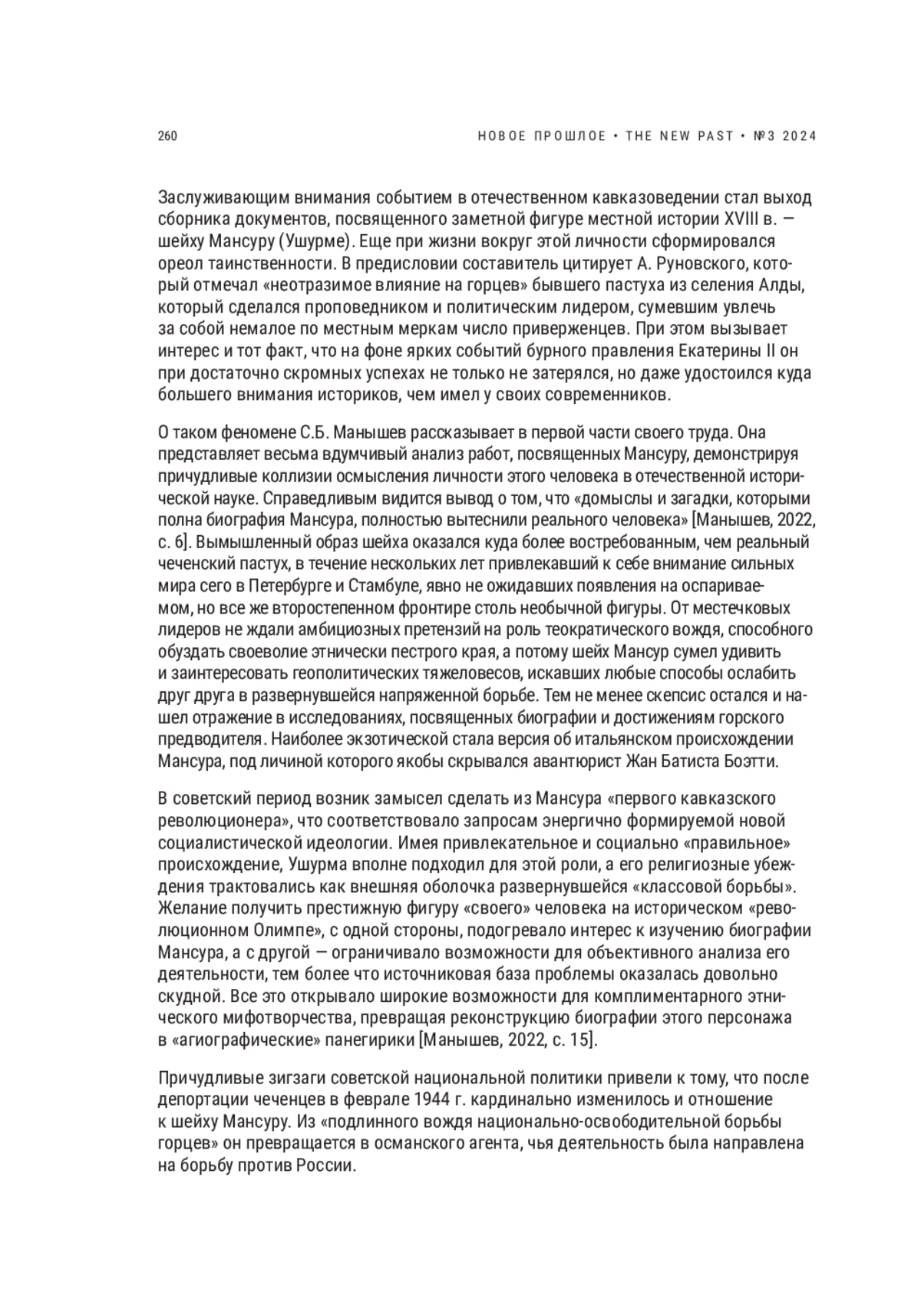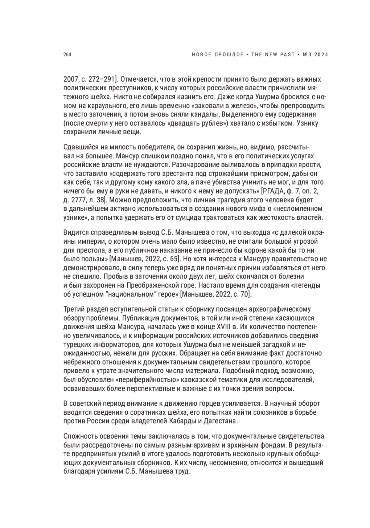КЛЫЧНИКОВ Ю. Ю. "ИМЕЛ НЕОТРАЗИМОЕ ВЛИЯНИЕ НА ГОРЦЕВ...": ШЕЙХ МАНСУР В КАВКАЗСКОЙ ИСТОРИИ (О СБОРНИКЕ ДОКУМЕНТОВ: МАНЫШЕВ С. Б. ШЕЙХ МАНСУР В МАТЕРИАЛАХ КИЗЛЯРСКОГО И МОЗДОКСКОГО КОМЕНДАНТСКИХ АРХИВОВ: СБ. ДОКУМЕНТОВ / ВЫЯВЛЕНИЕ, АРХЕОГРАФИЧ. ОБРАБОТКА, ПРЕДИСЛ., ВСТУП. СТ., КОММЕНТ., УКАЗАТЕЛИ С. Б. МАНЫШЕВА. М.: ИЗДАТЕЛЬСТВО "КУЧКОВО ПОЛЕ": ИКС-ХИСТОРИ, 2022. 464 С.: 8 Л. ИЛ.) // НОВОЕ ПРОШЛОЕ. 2024. № 3
