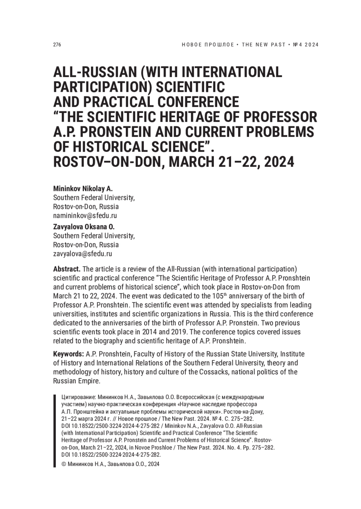 МИНИНКОВ Н. А., ЗАВЬЯЛОВА О. О. ВСЕРОССИЙСКАЯ (С МЕЖДУНАРОДНЫМ УЧАСТИЕМ) НАУЧНО-ПРАКТИЧЕСКАЯ КОНФЕРЕНЦИЯ «НАУЧНОЕ НАСЛЕДИЕ ПРОФЕССОРА А. П. ПРОНШТЕЙНА И АКТУАЛЬНЫЕ ПРОБЛЕМЫ ИСТОРИЧЕСКОЙ НАУКИ». РОСТОВ-НА-ДОНУ, 21-22 МАРТА 2024 Г // НОВОЕ ПРОШЛОЕ. 2024. № 4