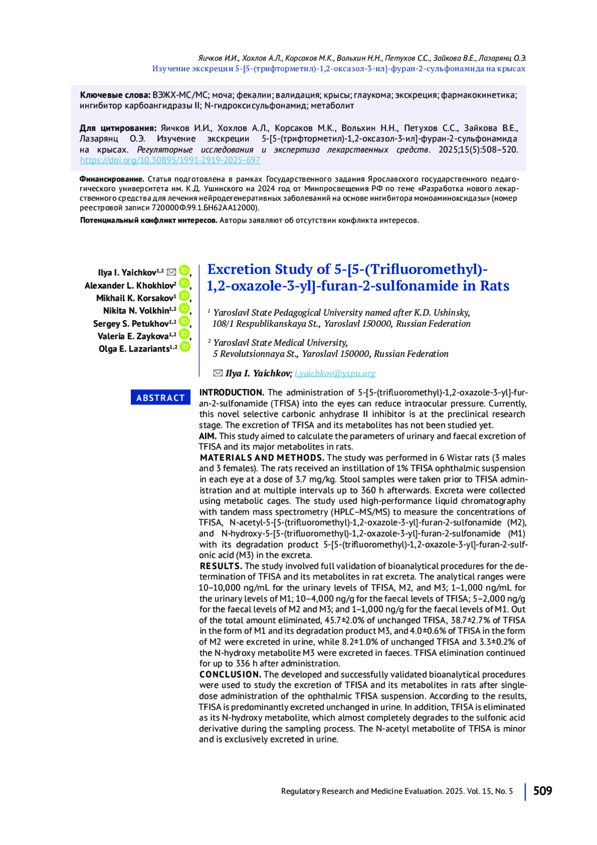 ВВЕДЕНИЕ. Новый селективный ингибитор карбоангидразы II типа 5-[5-(трифторметил)-1,2-оксазол-3-ил]-фуран-2-сульфонамид (TFISA) способен снижать внутриглазное давление при инстилляции в глаза. Данное соединение находится на стадии доклинического исследования. Процесс экскреции TFISA и его метаболитов ранее не изучен. ЦЕЛЬ. Определение параметров экскреции 5-[5-(трифторметил)-1,2-оксазол-3- ил]-фуран-2-сульфонамида и его основных метаболитов у крыс.