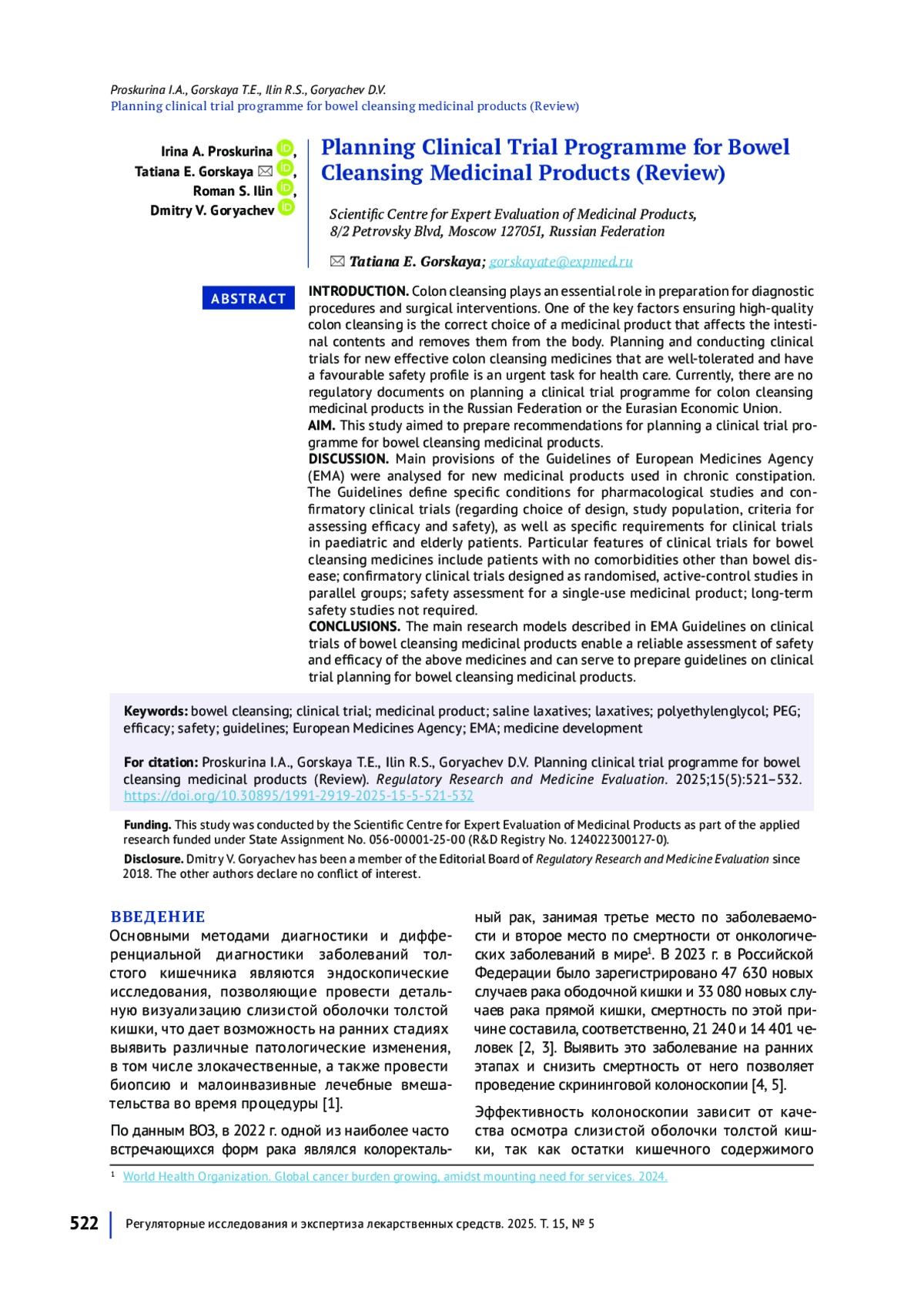 ОБСУЖДЕНИЕ. Проведен анализ основных положений руководства Европейского агентства по лекарственным средствам (EMA) по проведению КИ новых ЛП для очищения кишечника; даны рекомендации по проведению фармакологических исследований и подтверждающих КИ (дизайн, популяция исследования, критерии оценки эффективности и безопасности), а также проведению КИ у детей и пациентов пожилого возраста. Особенности КИ ЛП для очищения кишечника: в исследование включают пациентов с заболеванием кишечника, не имеющих иных заболеваний; дизайн подтверждающих КИ III фазы — рандомизированные, с активным контролем, в параллельных группах; необходима оценка безопасности при однократном применении ЛП, долгосрочные исследования безопасности не требуются.