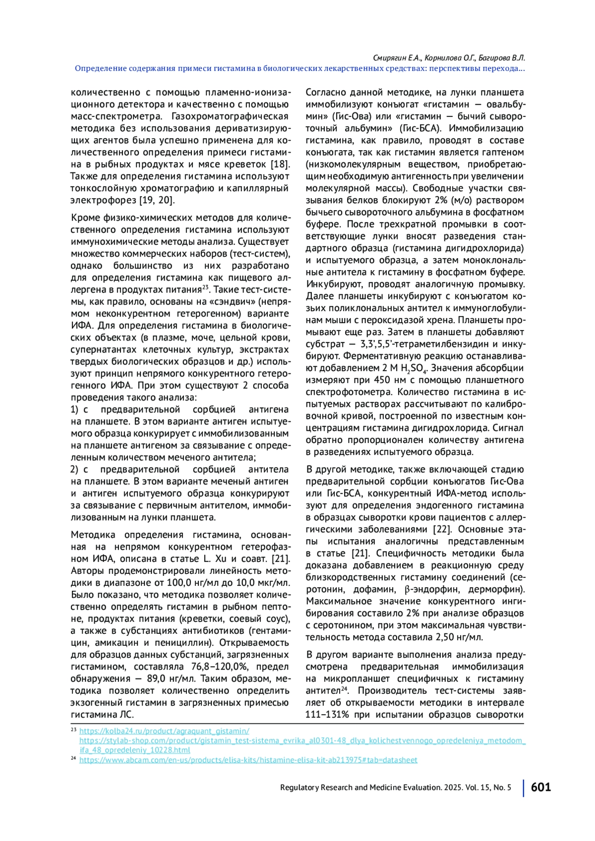 ВЫВОДЫ. В целях количественного определения примеси гистамина в биологических лекарственных средствах могут быть использованы методы ВЭЖХ и ИФА. Методики in vitro разрабатывают исходя из состава, строения и свойств матрицы исследуемой субстанции; для структурно гетерогенных матриц, например, для гепаринов, рекомендуется ВЭЖХ, для субстанций пептидной и белковой природы, например, для апротинина, — ИФА.