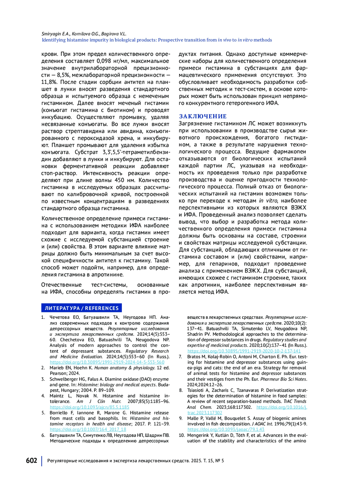 ОБСУЖДЕНИЕ. Проведен анализ стратегии Европейской фармакопеи, направленной на отказ от биологических испытаний на содержание примеси гистамина в ЛС. На основании анализа научной литературы установлены наиболее часто используемые физико-химические и иммунохимические методы количественного определения примеси гистамина. Систематизированы условия методик с применением метода высокоэффективной жидкостной хроматографии (ВЭЖХ). Показана возможность проведения непрямого конкурентного гетерофазного иммуноферментного анализа (ИФА) для количественной оценки гистамина в биологических лекарственных средствах. Обоснованы критерии выбора между ВЭЖХ и ИФА, основанные на специфике матрицы исследуемой субстанции.