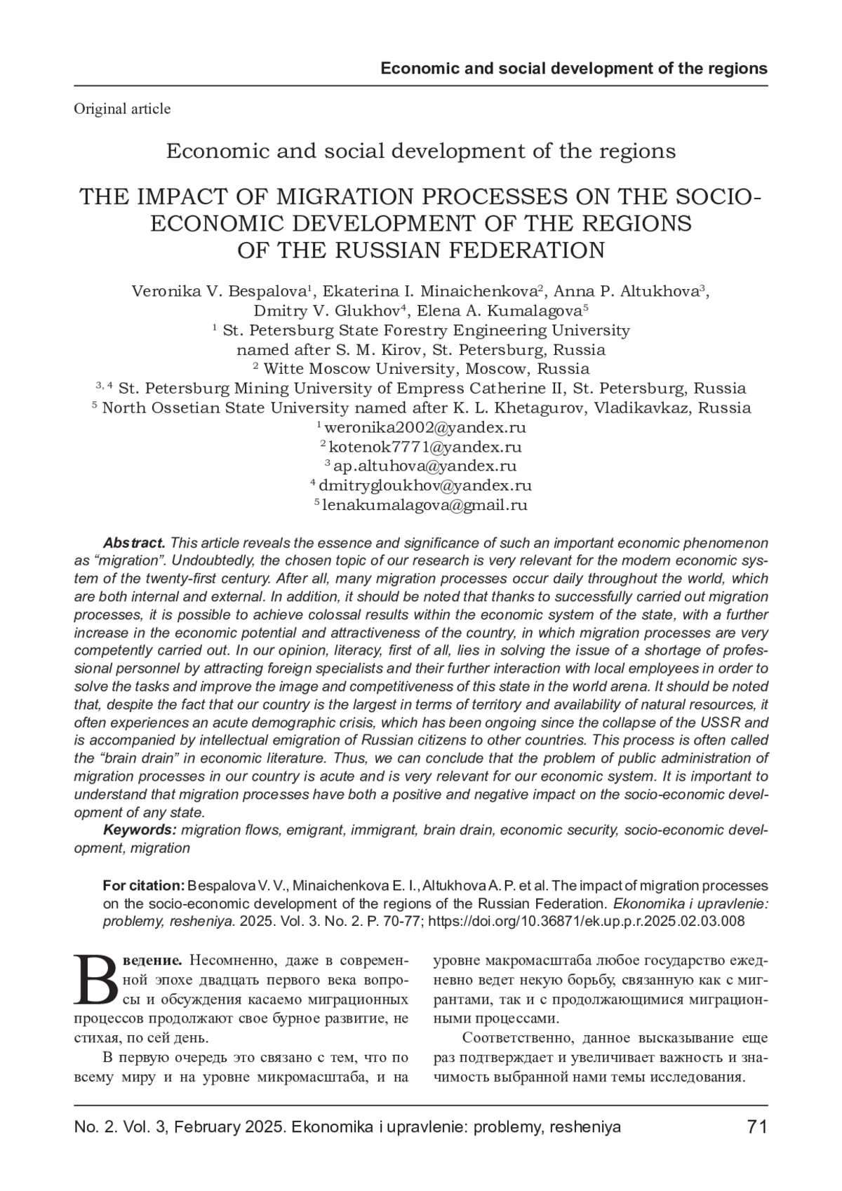 БЕСПАЛОВА В. В., МИНАЙЧЕНКОВА Е. И., АЛТУХОВА А. П., ГЛУХОВ Д. В., КУМАЛАГОВА Е. А. ВЛИЯНИЕ МИГРАЦИОННЫХ ПРОЦЕССОВ НА СОЦИАЛЬНО-ЭКОНОМИЧЕСКОЕ РАЗВИТИЕ РЕГИОНОВ РФ // ЭКОНОМИКА И УПРАВЛЕНИЕ: ПРОБЛЕМЫ, РЕШЕНИЯ. 2025. ТОМ 3 № 2