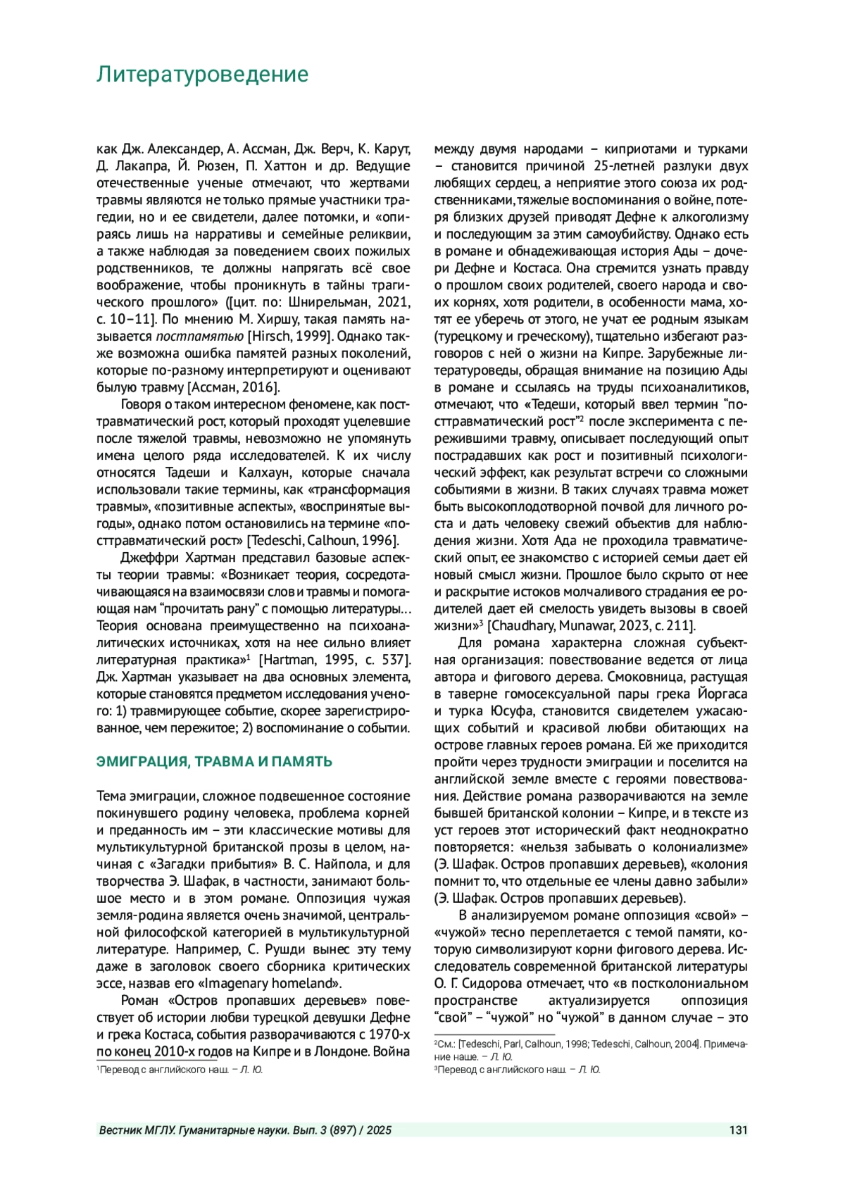 ЮЗМУХАМЕТОВА Л. Н. МУЛЬТИКУЛЬТУРНАЯ БРИТАНСКАЯ ПРОЗА: РОМАН ЭЛИФ ШАФАК «ОСТРОВ ПРОПАВШИХ ДЕРЕВЬЕВ» // ВЕСТНИК МОСКОВСКОГО ГОСУДАРСТВЕННОГО ЛИНГВИСТИЧЕСКОГО УНИВЕРСИТЕТА. ГУМАНИТАРНЫЕ НАУКИ. 2025. № 3 (897)