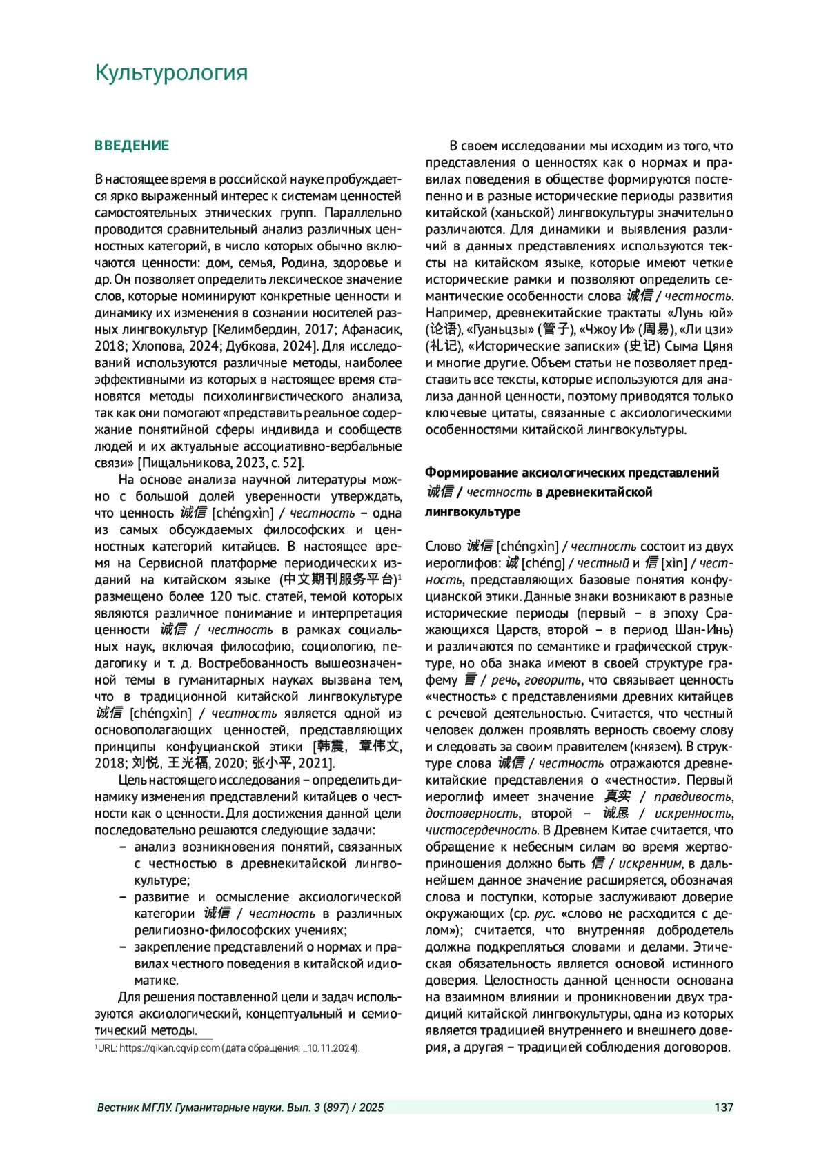 15. Дубкова О. В. Закономерности формирования базовых ценностей (на материале древнекитайской лингвокультуры) // Вестник Московского государственного лингвистического университета. Гуманитарные науки. 2024. Вып. 9 (890). С. 44-50. EDN: WCAWQU