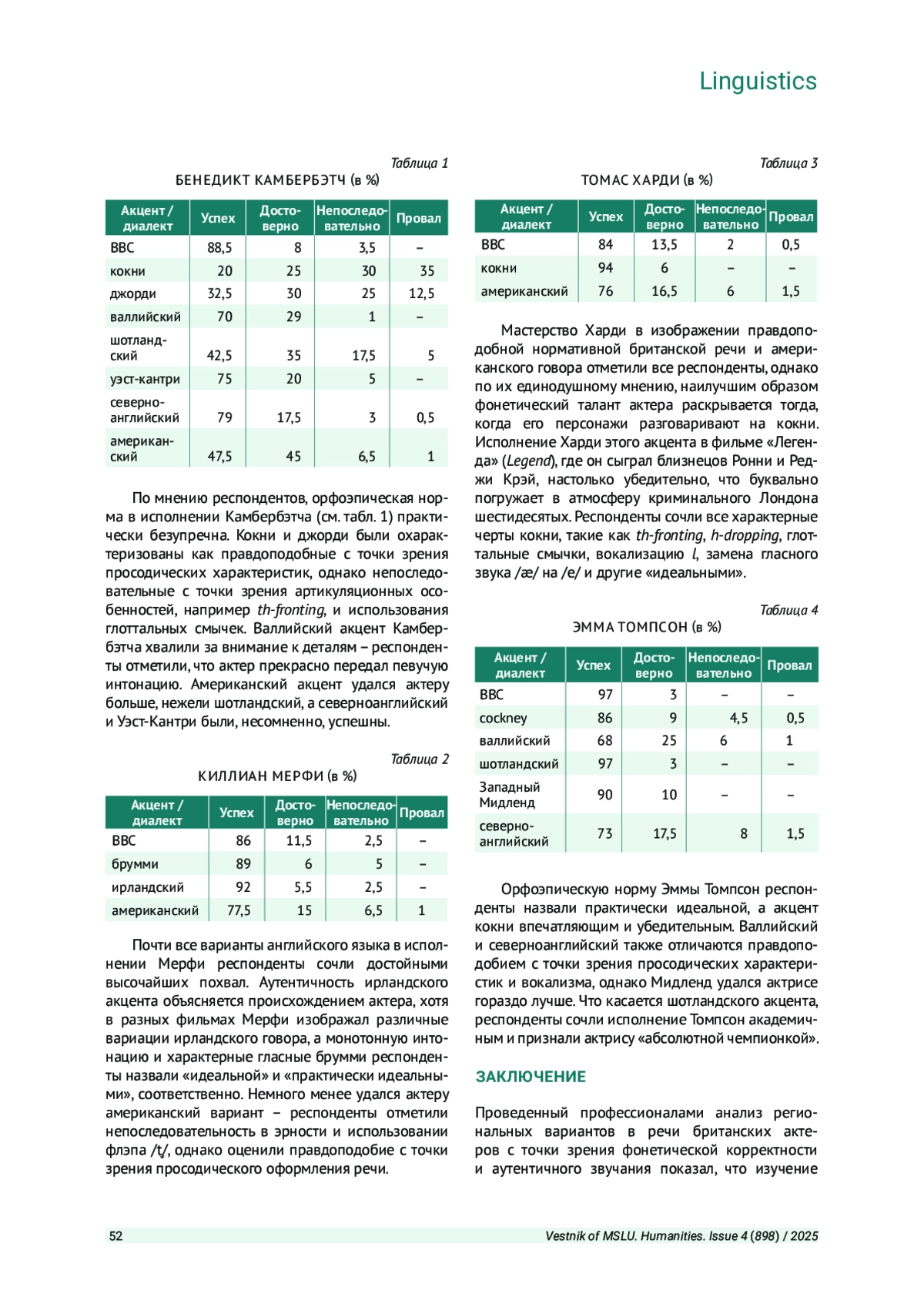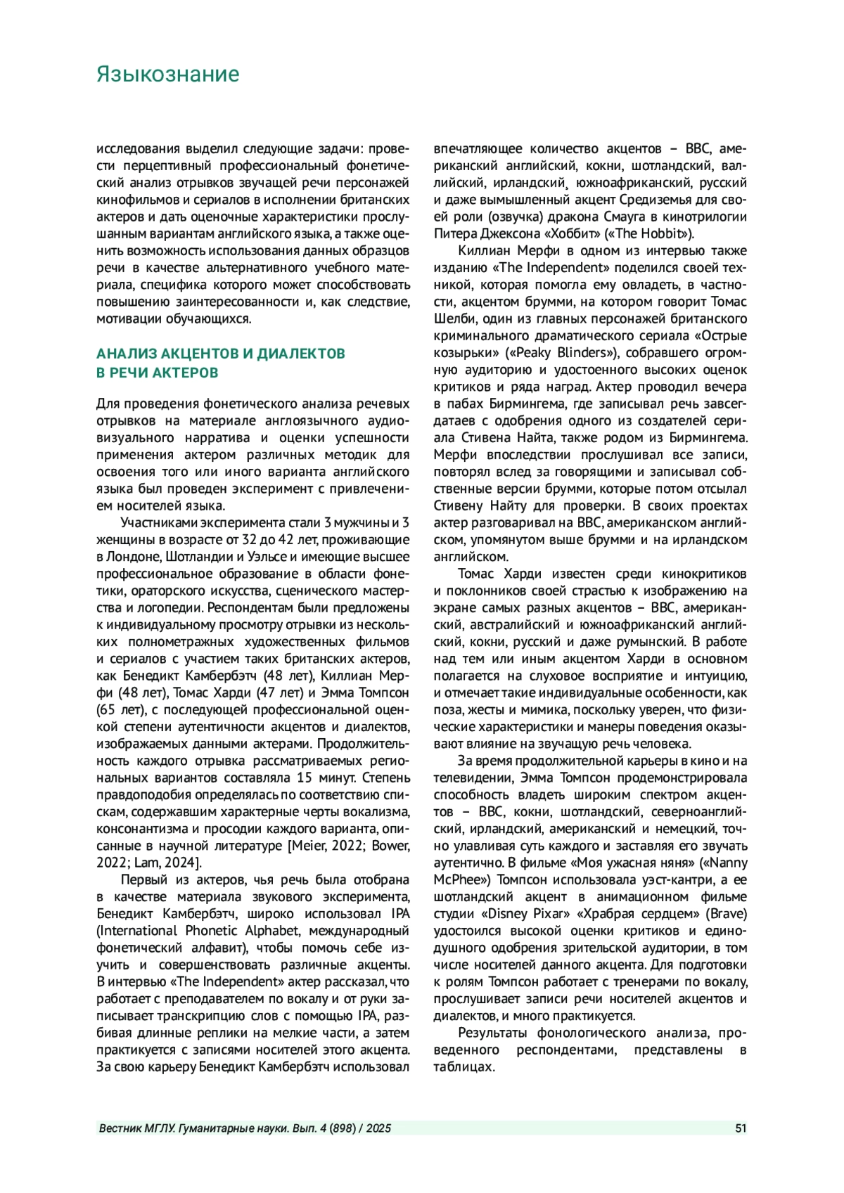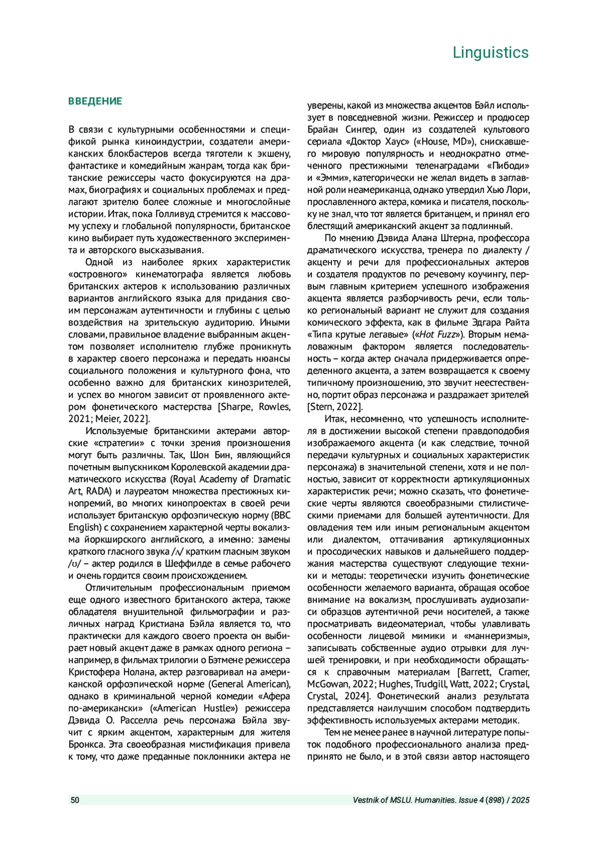 КУЛИКОВА К. С. РЕГИОНАЛЬНЫЕ АКЦЕНТЫ В СЦЕНИЧЕСКОЙ РЕЧИ (НА МАТЕРИАЛЕ СОВРЕМЕННОГО БРИТАНСКОГО КИНЕМАТОГРАФА) // ВЕСТНИК МОСКОВСКОГО ГОСУДАРСТВЕННОГО ЛИНГВИСТИЧЕСКОГО УНИВЕРСИТЕТА. ГУМАНИТАРНЫЕ НАУКИ. 2025. № 4 (898)