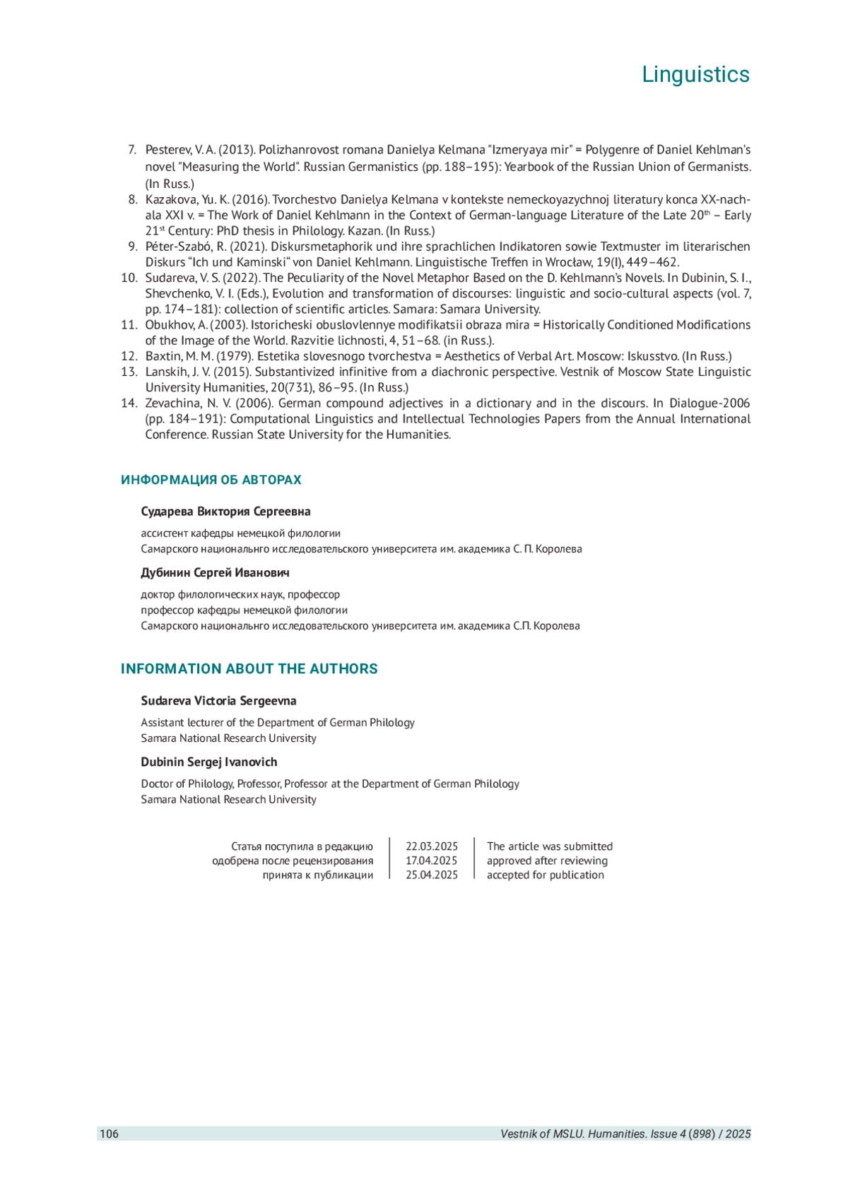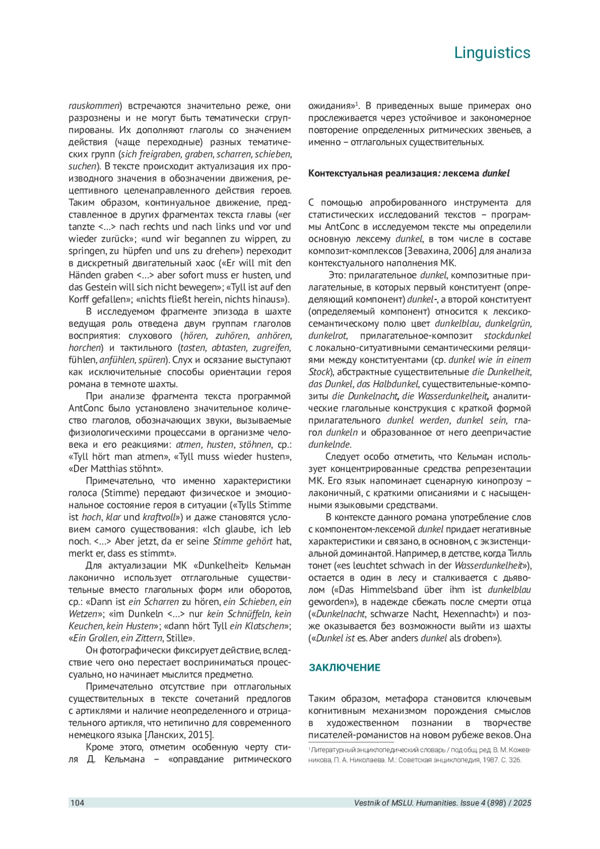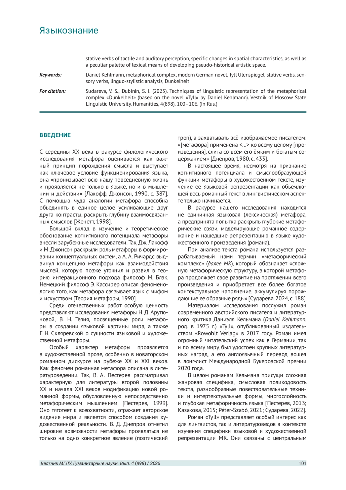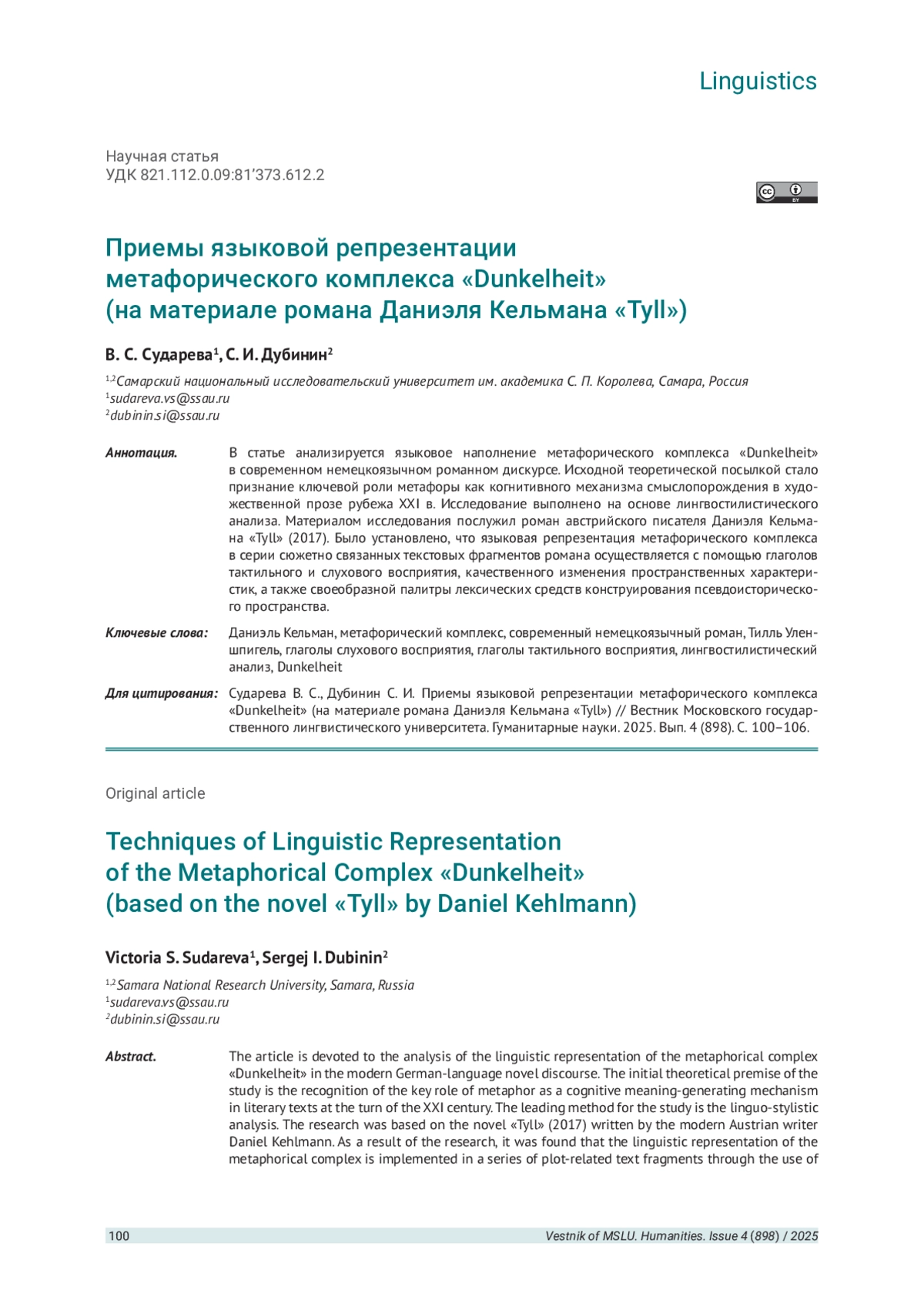 ДУБИНИН С. И., СУДАРЕВА В. С. ПРИЕМЫ ЯЗЫКОВОЙ РЕПРЕЗЕНТАЦИИ МЕТАФОРИЧЕСКОГО КОМПЛЕКСА «DUNKELHEIT» (НА МАТЕРИАЛЕ РОМАНА ДАНИЭЛЯ КЕЛЬМАНА «TYLL») // ВЕСТНИК МОСКОВСКОГО ГОСУДАРСТВЕННОГО ЛИНГВИСТИЧЕСКОГО УНИВЕРСИТЕТА. ГУМАНИТАРНЫЕ НАУКИ. 2025. № 4 (898)
