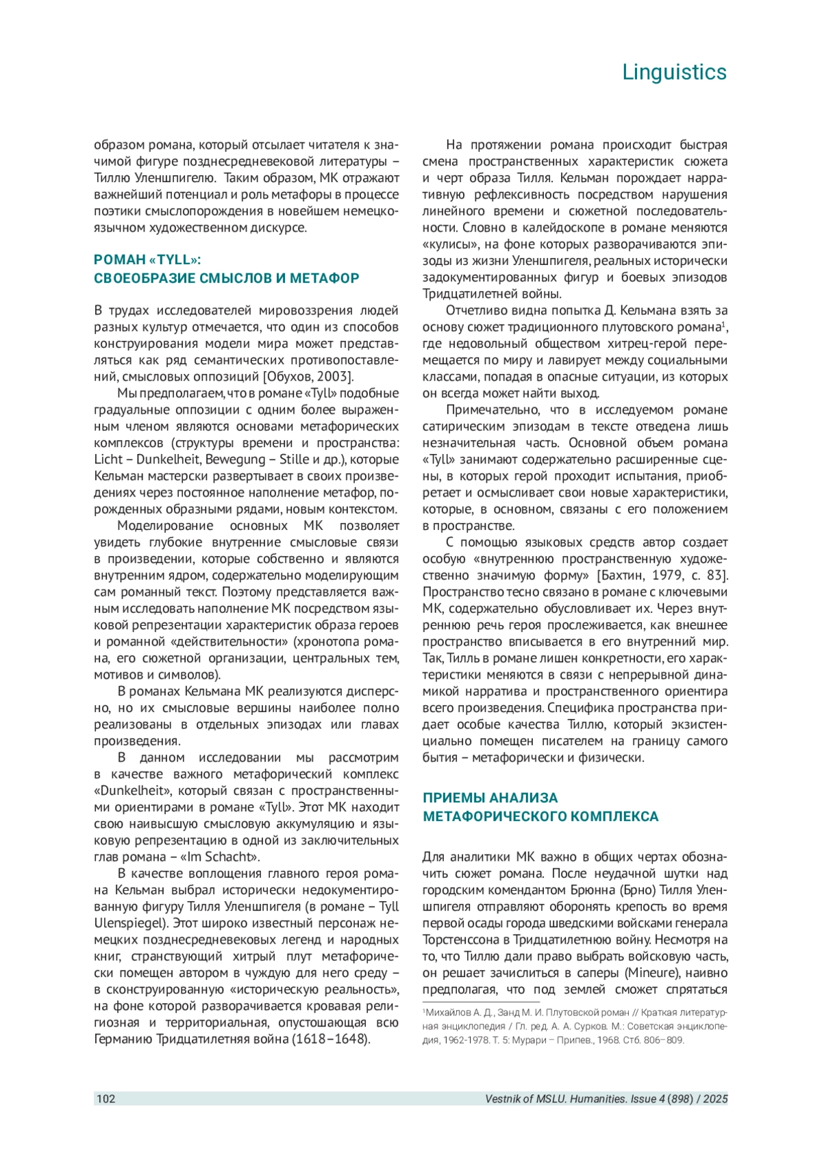 Статья: ПРИЕМЫ ЯЗЫКОВОЙ РЕПРЕЗЕНТАЦИИ МЕТАФОРИЧЕСКОГО КОМПЛЕКСА «DUNKELHEIT» (НА МАТЕРИАЛЕ РОМАНА ДАНИЭЛЯ КЕЛЬМАНА «TYLL») (2025)