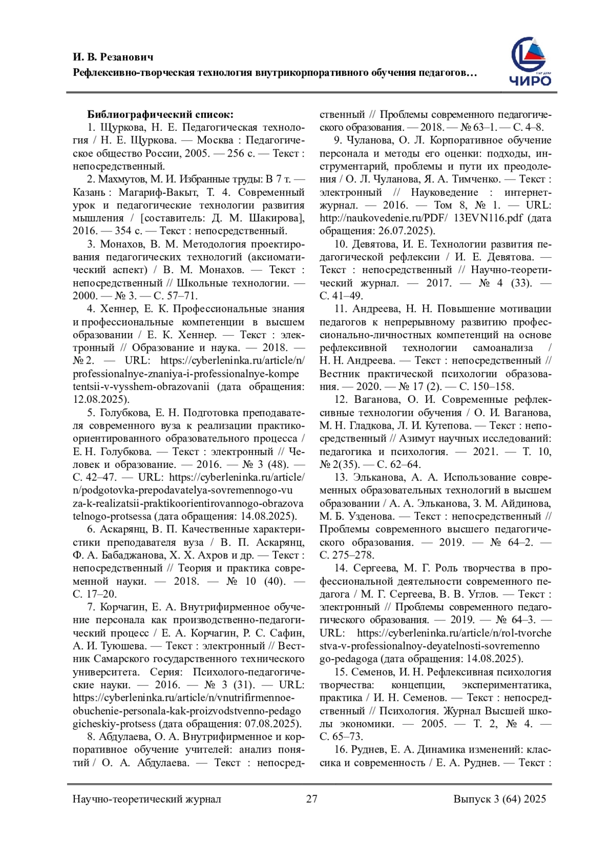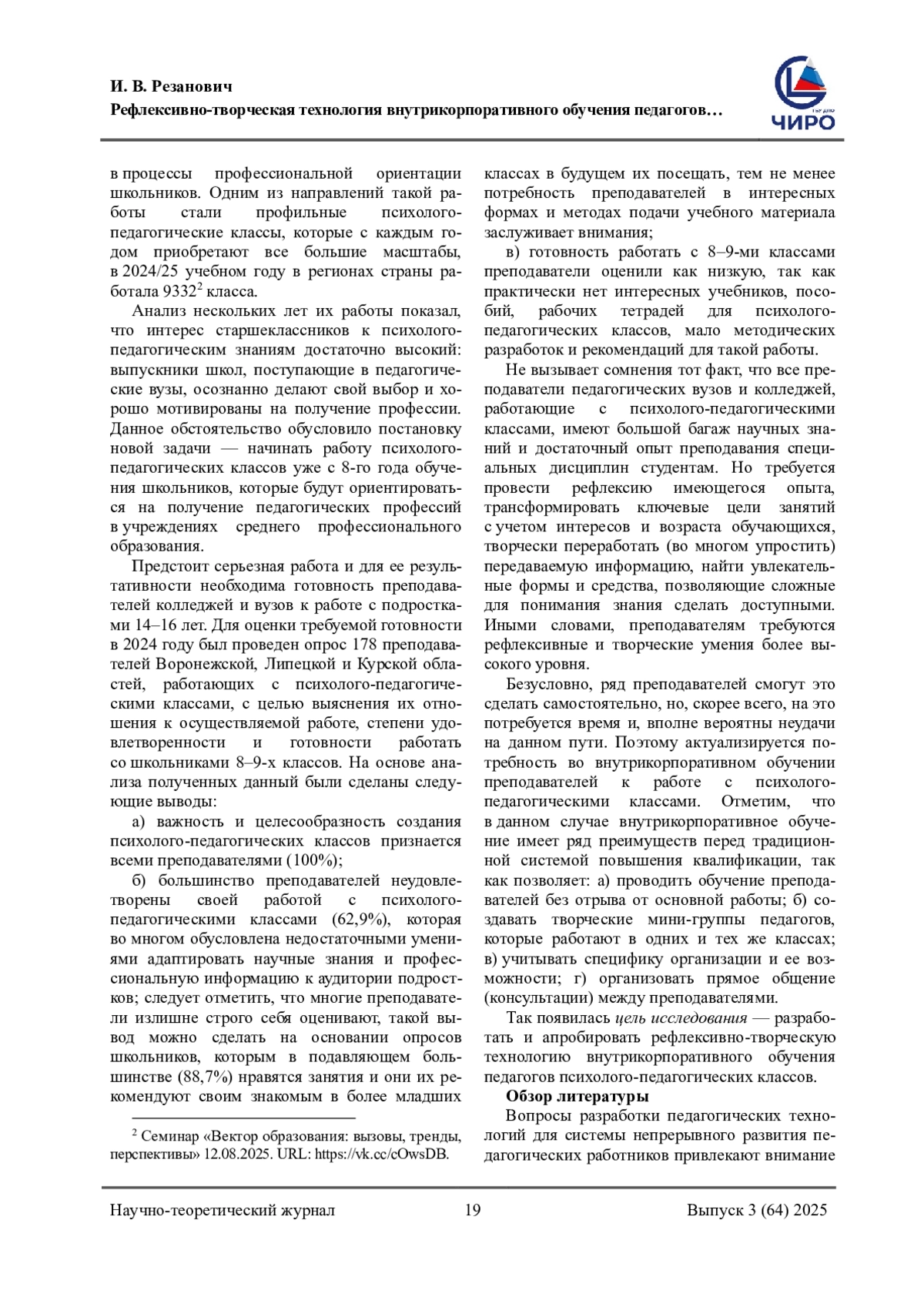 РЕЗАНОВИЧ И. В. РЕФЛЕКСИВНО-ТВОРЧЕСКАЯ ТЕХНОЛОГИЯ ВНУТРИКОРПОРАТИВНОГО ОБУЧЕНИЯ ПЕДАГОГОВ ПСИХОЛОГО-ПЕДАГОГИЧЕСКИХ КЛАССОВ // НАУЧНОЕ ОБЕСПЕЧЕНИЕ СИСТЕМЫ ПОВЫШЕНИЯ КВАЛИФИКАЦИИ КАДРОВ. 2025. № 3 (64) (13 СТ.)