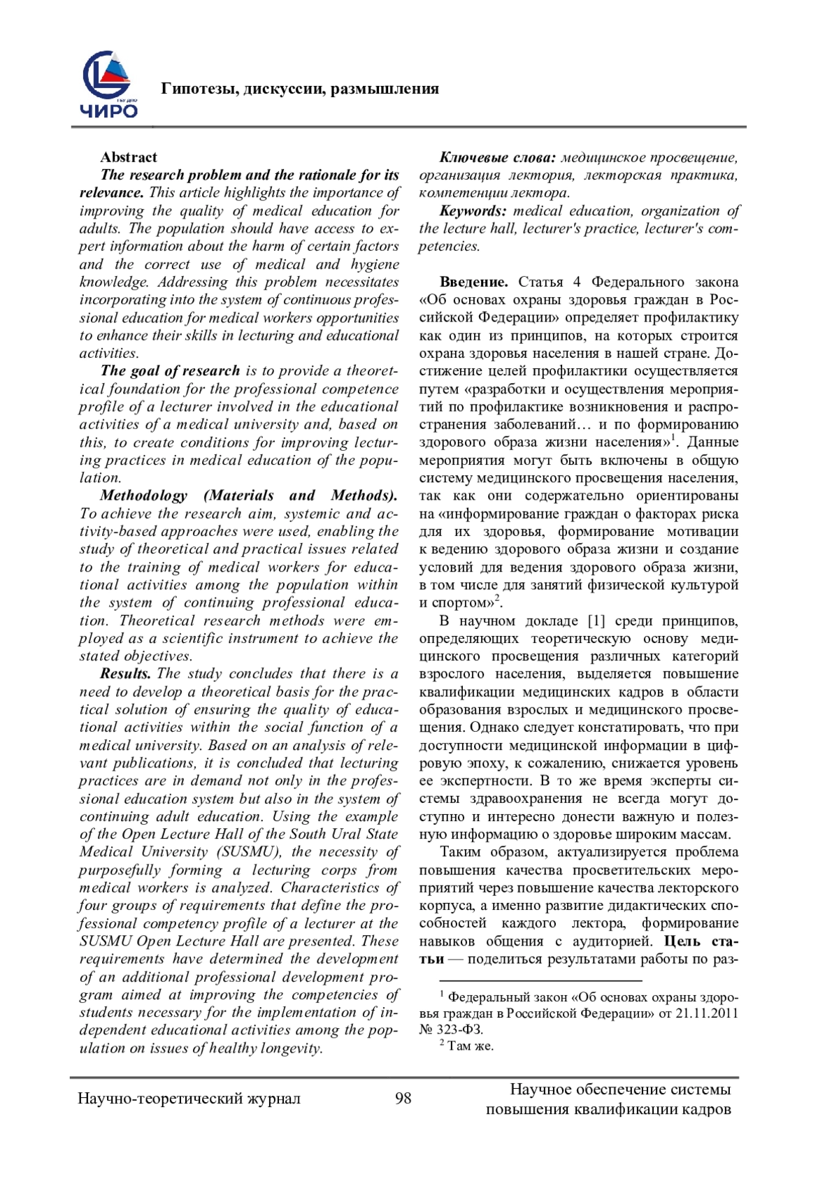Проблема исследования и обоснование ее актуальности. В статье актуализируется проблема повышения качества медицинского просвещения взрослых. Населению должна быть доступна экспертная информация о вреде тех или иных факторов и о правильном использовании медицинских и гигиенических знаний. Решение поставленной проблемы обусловливает включение в систему непрерывного профессионального образования медицинских работников повышения их квалификации в области лекторской и просветительской деятельности. Цель исследования - теоретическое обоснование профиля профессиональных компетенций лектора - участника просветительской деятельности медицинского университета и на его основе создание условий для совершенствования лекторской практики в медицинском просвещении населения. Методология (материалы и методы). Для достижения цели исследования применялись системный и деятельностный подходы, позволившие изучить теоретические и практические вопросы подготовки медицинских работников, ориентированных на просветительскую деятельность среди населения, в системе дополнительного профессионального образования. В качестве научного инструмента для достижения поставленных задач были использованы теоретические методы исследования. Результаты. В ходе исследования делается заключение о необходимости развития теоретической базы для практического решения проблемы обеспечения качества просветительской деятельности в рамках социальной функции медицинского университета. По результатам анализа релевантных публикаций делается вывод, что лекторская практика востребована не только в системе профессионального образования, но и в системе дополнительного образования взрослых. На примере работы Открытого лектория Южно-Уральского государственного медицинского университета (ЮУГМУ) анализируется необходимость целенаправленного формирования лекторского корпуса из медицинских работников. Представлены характеристики четырех групп требований, определяющих профиль профессиональных компетенций лектора Открытого лектория ЮУГМУ. Данные требования определили разработку дополнительной профессиональной программы повышения квалификации, целью которой является совершенствование у слушателей компетенций, необходимых для реализации самостоятельной просветительской деятельности среди населения по вопросам здорового долголетия. Статья предназначена для работников системы дополнительного профессионального образования в здравоохранении, научных специалистов, руководителей медицинских организаций.