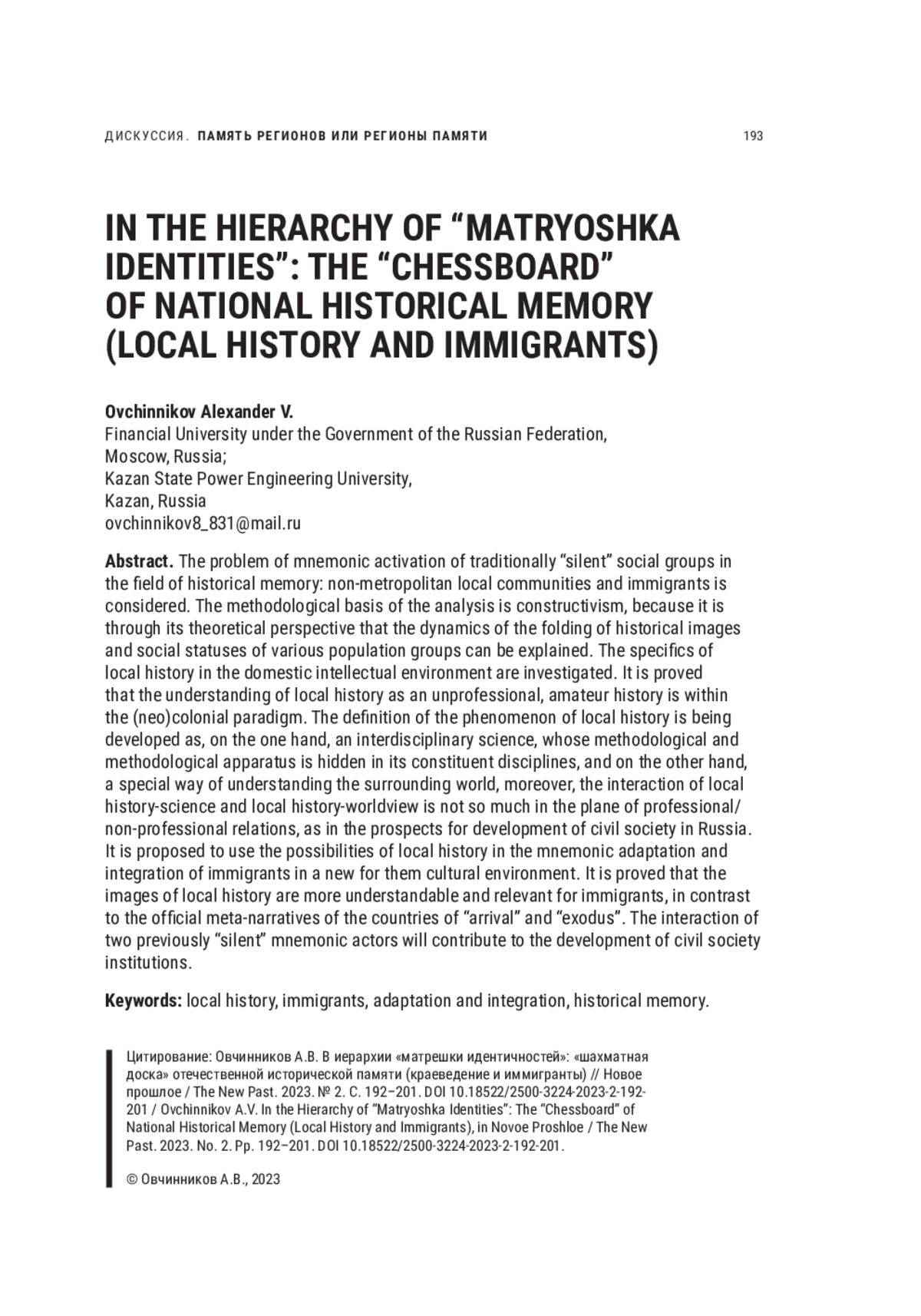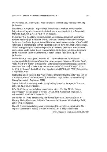 7. Овчинников А.В. К проблеме преемственности советских и постсоветских региональных национальных историй: по материалам ТАССР/Татарстана // Историческая память в постнациональном мире: мифы, ритуалы, репрезентации. Сборник статей по итогам Всероссийской научной конференции. Саратов: ИЦ “Наука”, 2017. С. 86-96. EDN: ZWVBAF