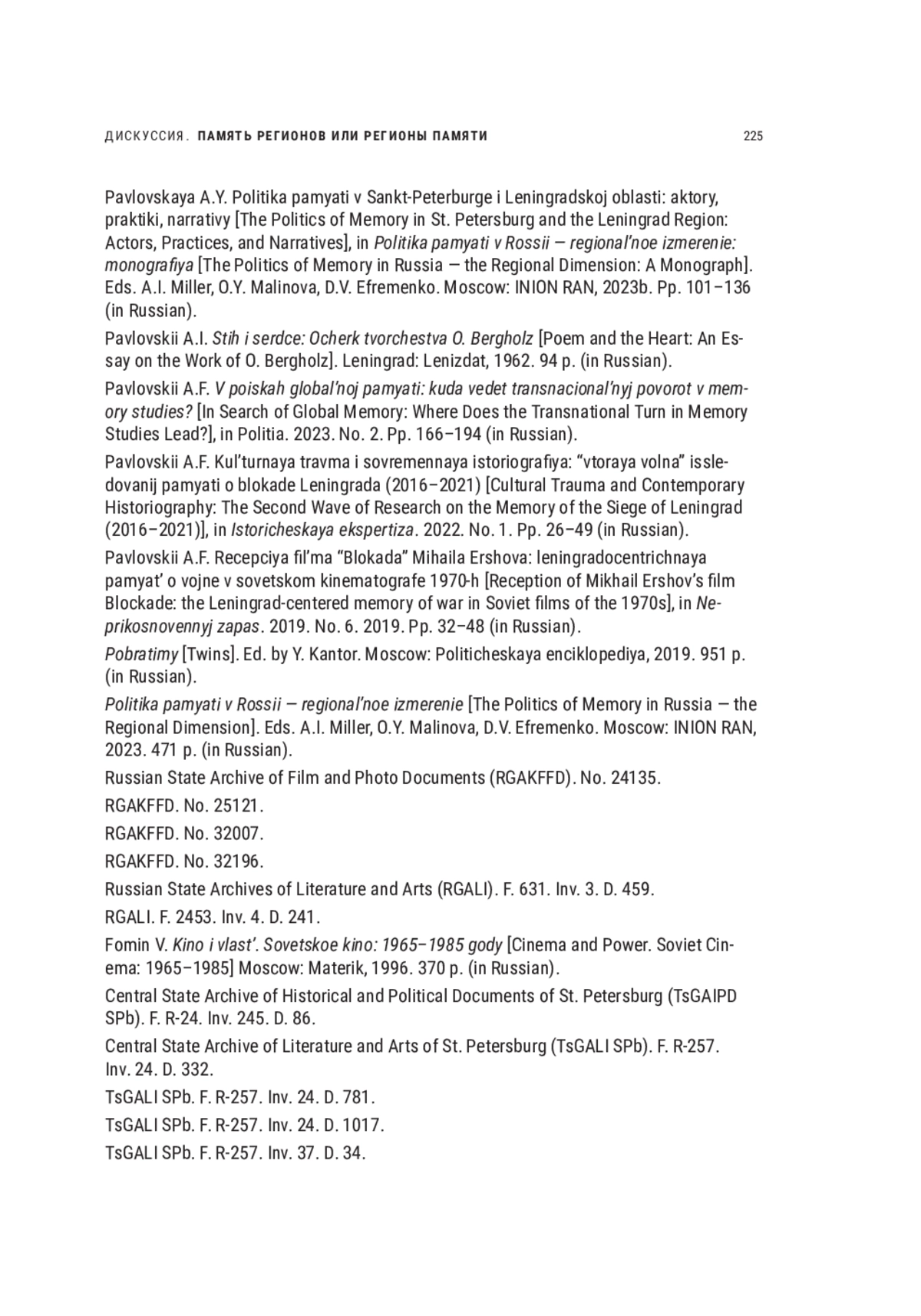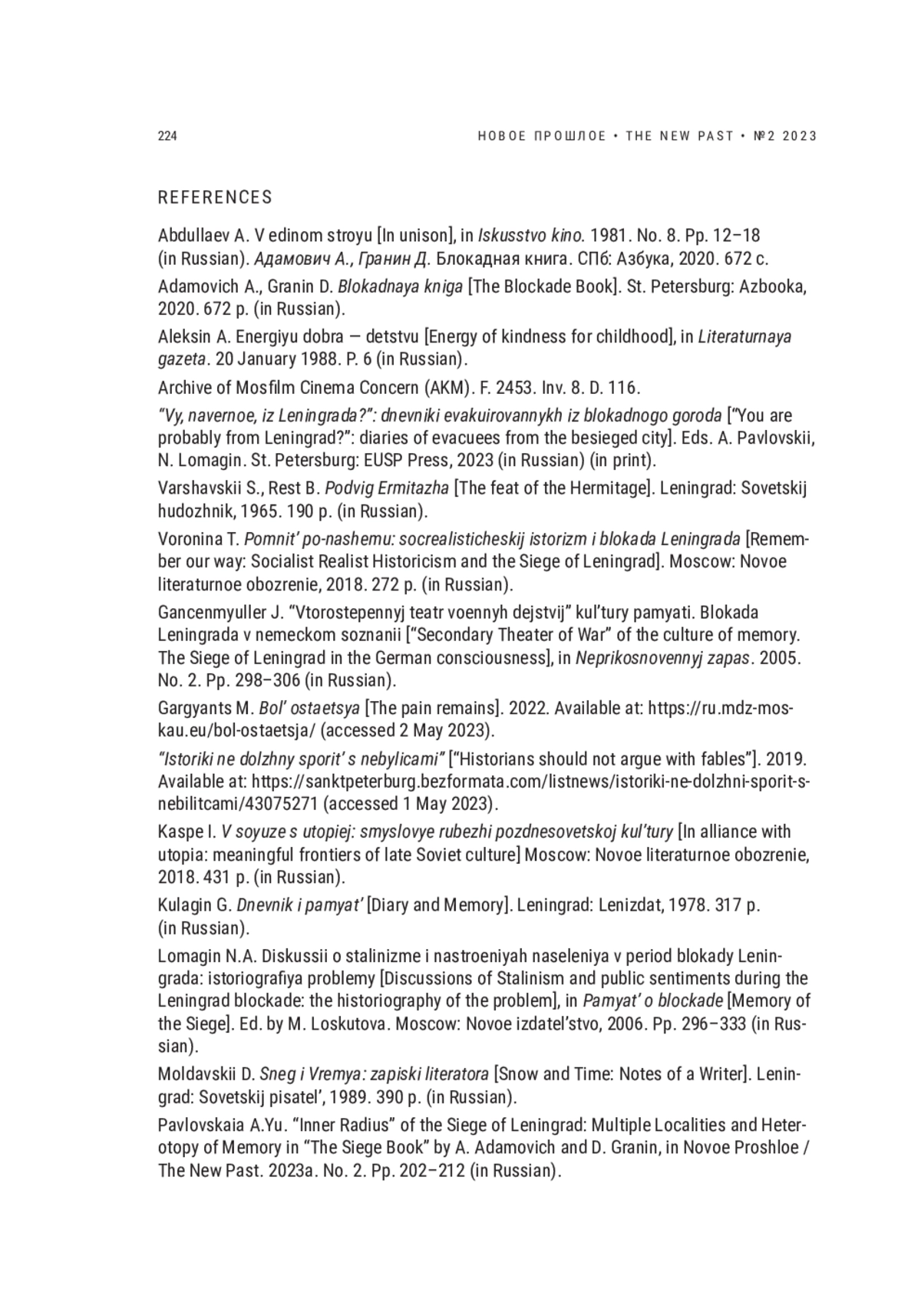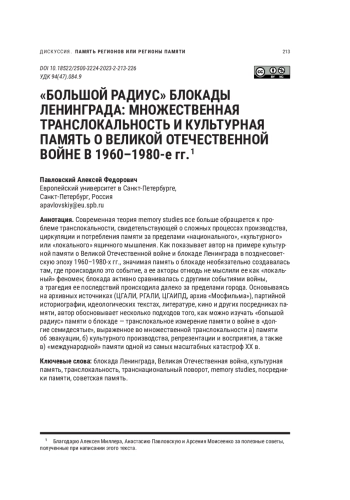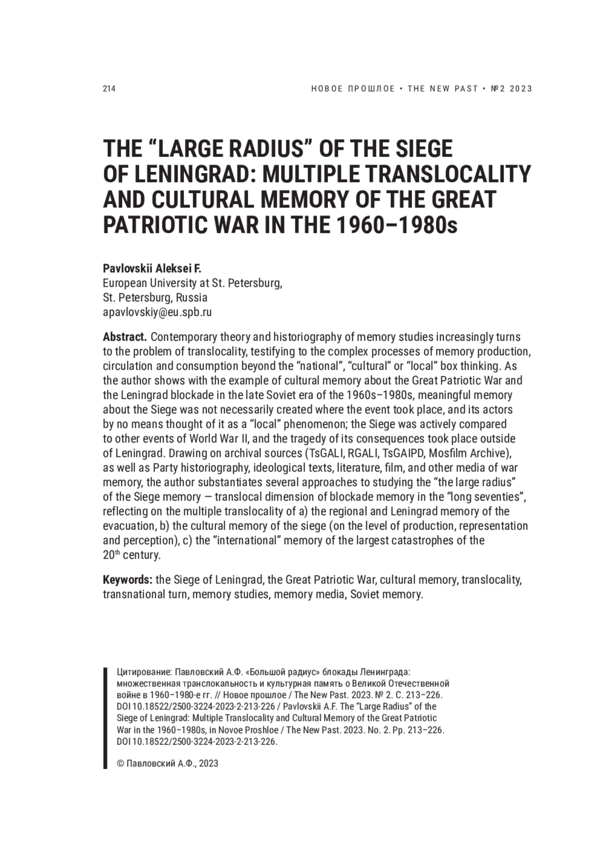 ПАВЛОВСКИЙ А. Ф. "БОЛЬШОЙ РАДИУС" БЛОКАДЫ ЛЕНИНГРАДА: МНОЖЕСТВЕННАЯ ТРАНСЛОКАЛЬНОСТЬ И КУЛЬТУРНАЯ ПАМЯТЬ О ВЕЛИКОЙ ОТЕЧЕСТВЕННОЙ ВОЙНЕ В 1960-1980-Е ГГ // НОВОЕ ПРОШЛОЕ. 2023. № 2