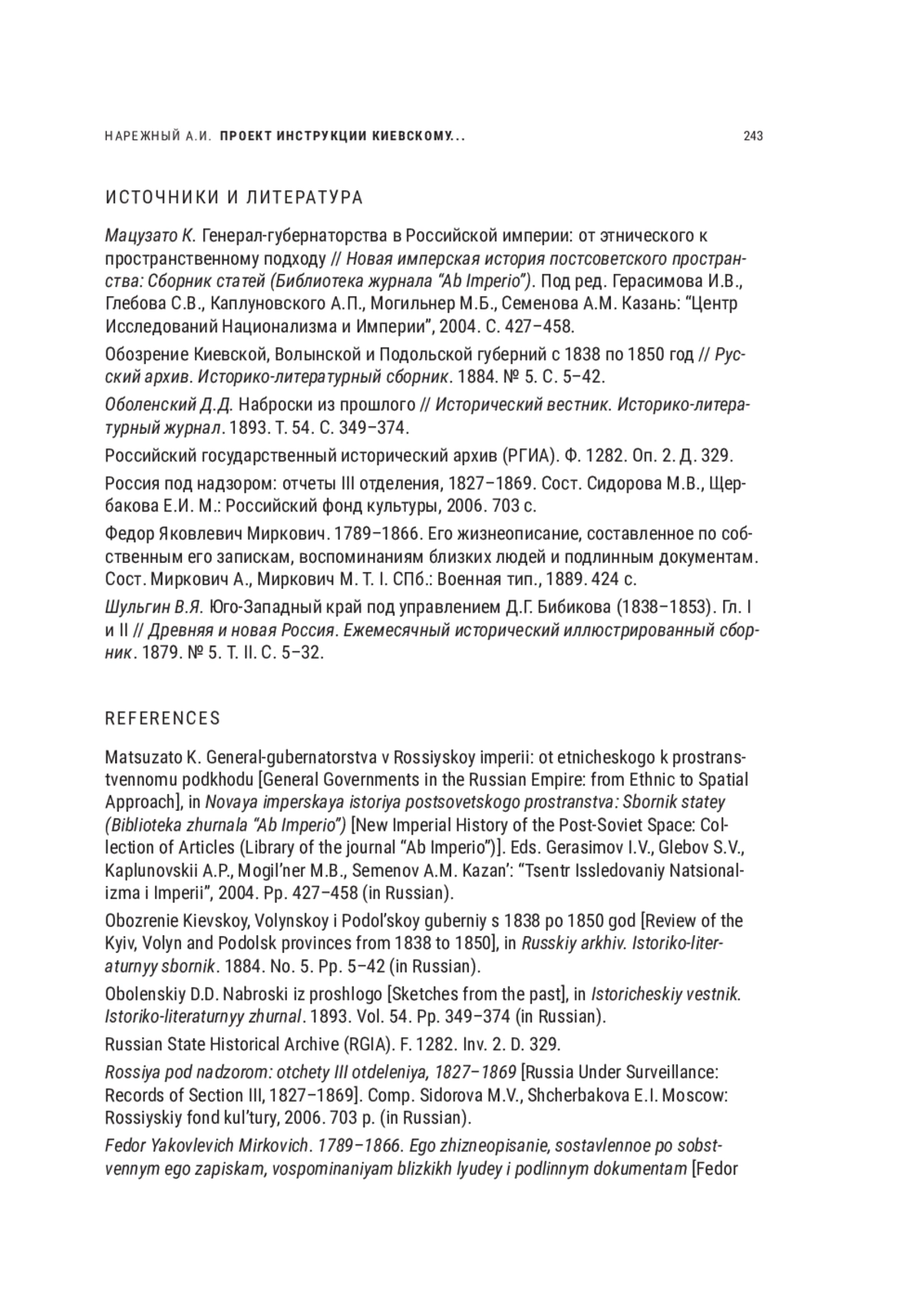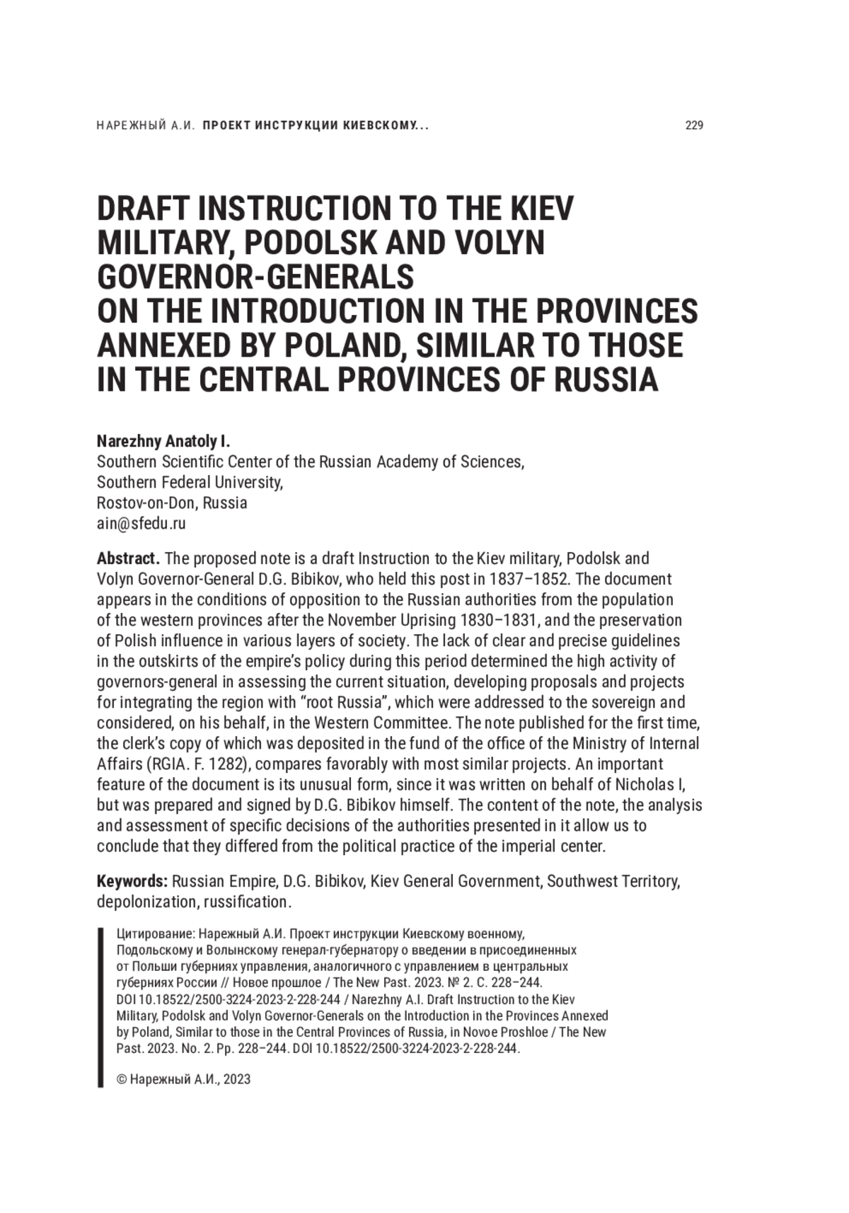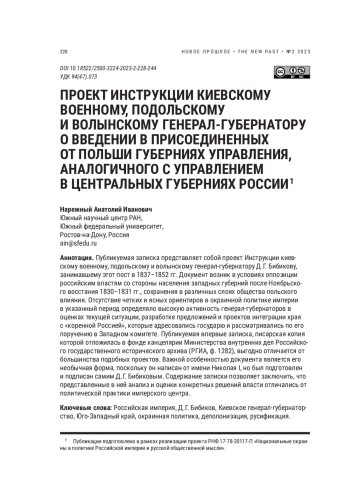 НАРЕЖНЫЙ А. И. ПРОЕКТ ИНСТРУКЦИИ КИЕВСКОМУ ВОЕННОМУ, ПОДОЛЬСКОМУ И ВОЛЫНСКОМУ ГЕНЕРАЛ - ГУБЕРНАТОРУ О ВВЕДЕНИИ В ПРИСОЕДИНЕННЫХ ОТ ПОЛЬШИ ГУБЕРНИЯХ УПРАВЛЕНИЯ, АНАЛОГИЧНОГО С УПРАВЛЕНИЕМ В ЦЕНТРАЛЬНЫХ ГУБЕРНИЯХ РОССИИ // НОВОЕ ПРОШЛОЕ. 2023. № 2