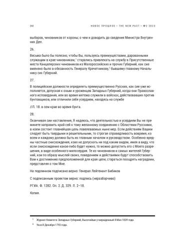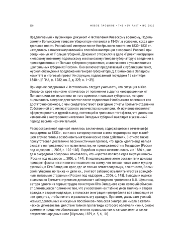 Публикуемая записка представляет собой проект Инструкции киевскому военному, подольскому и волынскому генерал-губернатору Д. Г. Бибикову, занимавшему этот пост в 1837–1852 гг. Документ возник в условиях оппозиции российским властям со стороны населения западных губерний после Ноябрьского восстания 1830–1831 гг., сохранения в различных слоях общества польского влияния. Отсутствие четких и ясных ориентиров в окраинной политике империи в указанный период определяло высокую активность генерал-губернаторов в оценках текущей ситуации, разработке предложений и проектов интеграции края с «коренной Россией», которые адресовались государю и рассматривались по его поручению в Западном комитете. Публикуемая впервые записка, писарская копия которой отложилась в фонде канцелярии Министерства внутренних дел Российского государственного исторического архива (РГИА, ф. 1282), выгодно отличается от большинства подобных проектов. Важной особенностью документа является его необычная форма, поскольку он написан от имени Николая I, но был подготовлен и подписан самим Д. Г. Бибиковым. Содержание записки позволяет заключить, что представленные в ней анализ и оценки конкретных решений власти отличались от политической практики имперского центра
