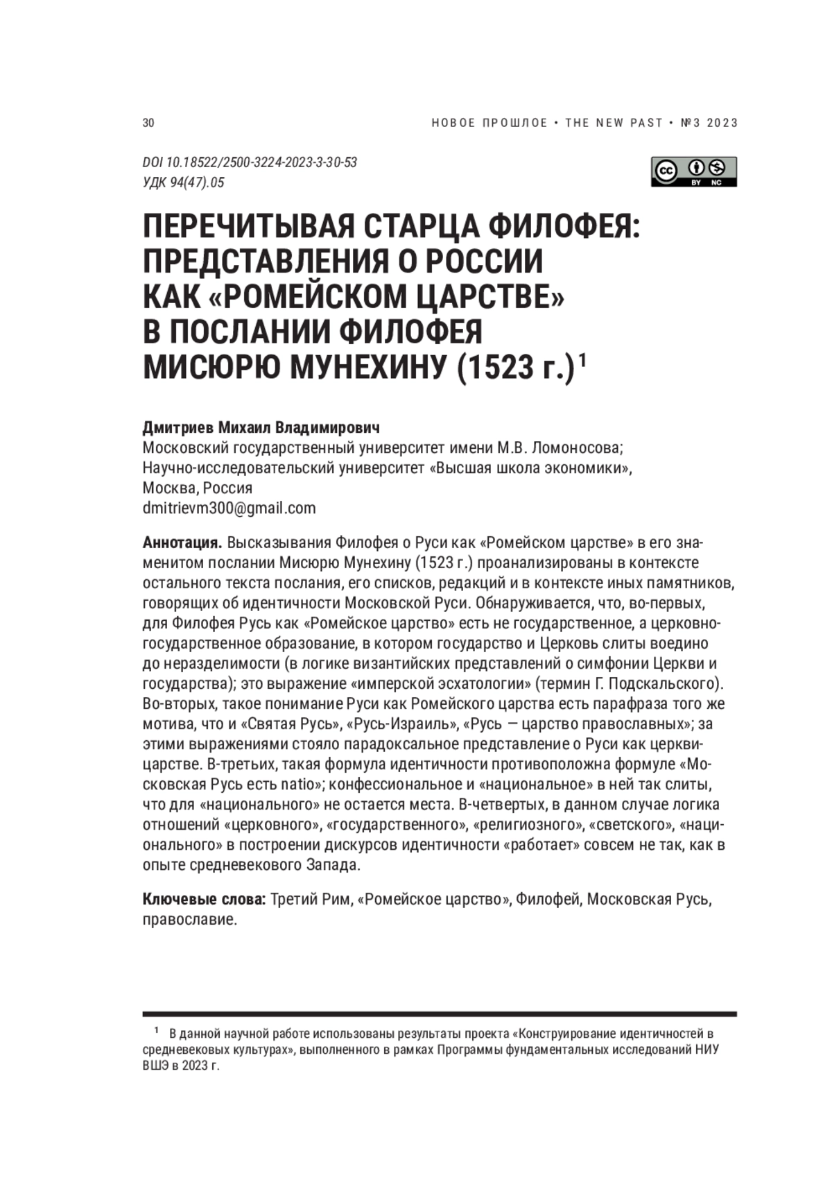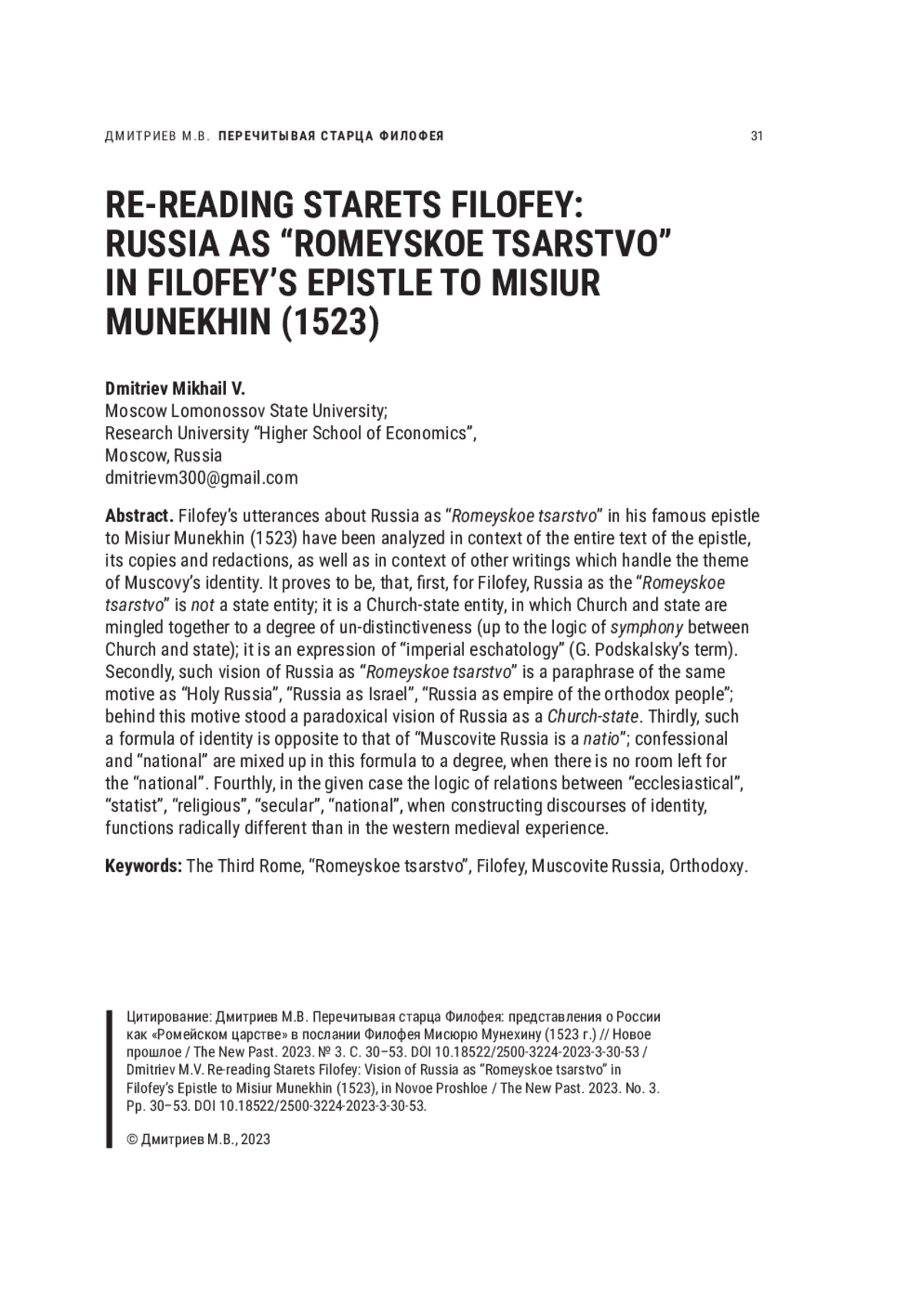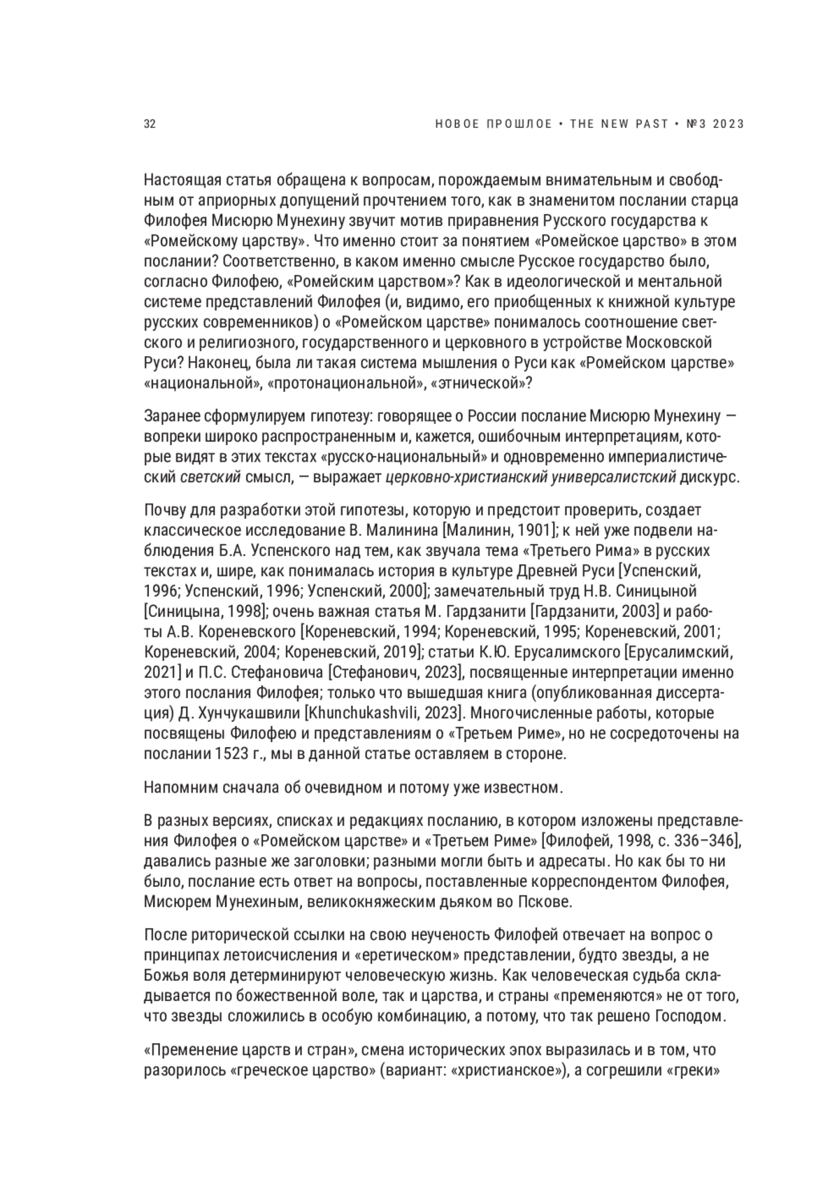 ДМИТРИЕВ М. В. ПЕРЕЧИТЫВАЯ СТАРЦА ФИЛОФЕЯ: ПРЕДСТАВЛЕНИЯ О РОССИИ КАК "РОМЕЙСКОМ ЦАРСТВЕ" В ПОСЛАНИИ ФИЛОФЕЯ МИСЮРЮ МУНЕХИНУ (1523 Г.) // НОВОЕ ПРОШЛОЕ. 2023. № 3