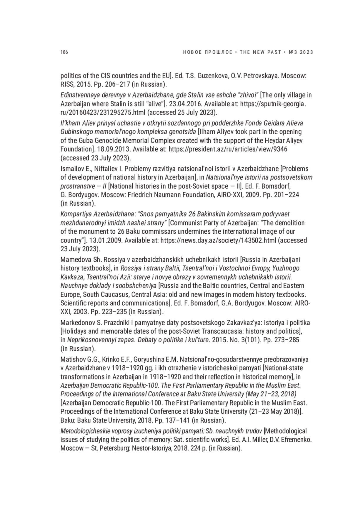 Историческая политика современного Азербайджана представляет несомненный интерес и изучается исследователями в рамках как обобщающих работ, посвященных процессам конструирования прошлого в постсоветских государствах Южного Кавказа [Шнирельман, 2003; Маркедонов, 2015; Токарев, 2017; Волхонский, Ярлыкапов, 2023 и др.], так и специальных публикаций [Смит, 2001; Мамедова, 2003; Исмаилов, Нифталиев, 2009 и др.]. Предметом самостоятельного исследования стали вопросы сохранения в республике памяти о Великой Отечественной войне [Дарвай, 2015 и др.] и другие сюжеты [Матишов, Кринко, Горюшина, 2018]. Однако опыт репрезентации советской истории в культуре памяти Азербайджана нельзя считать достаточно изученным.