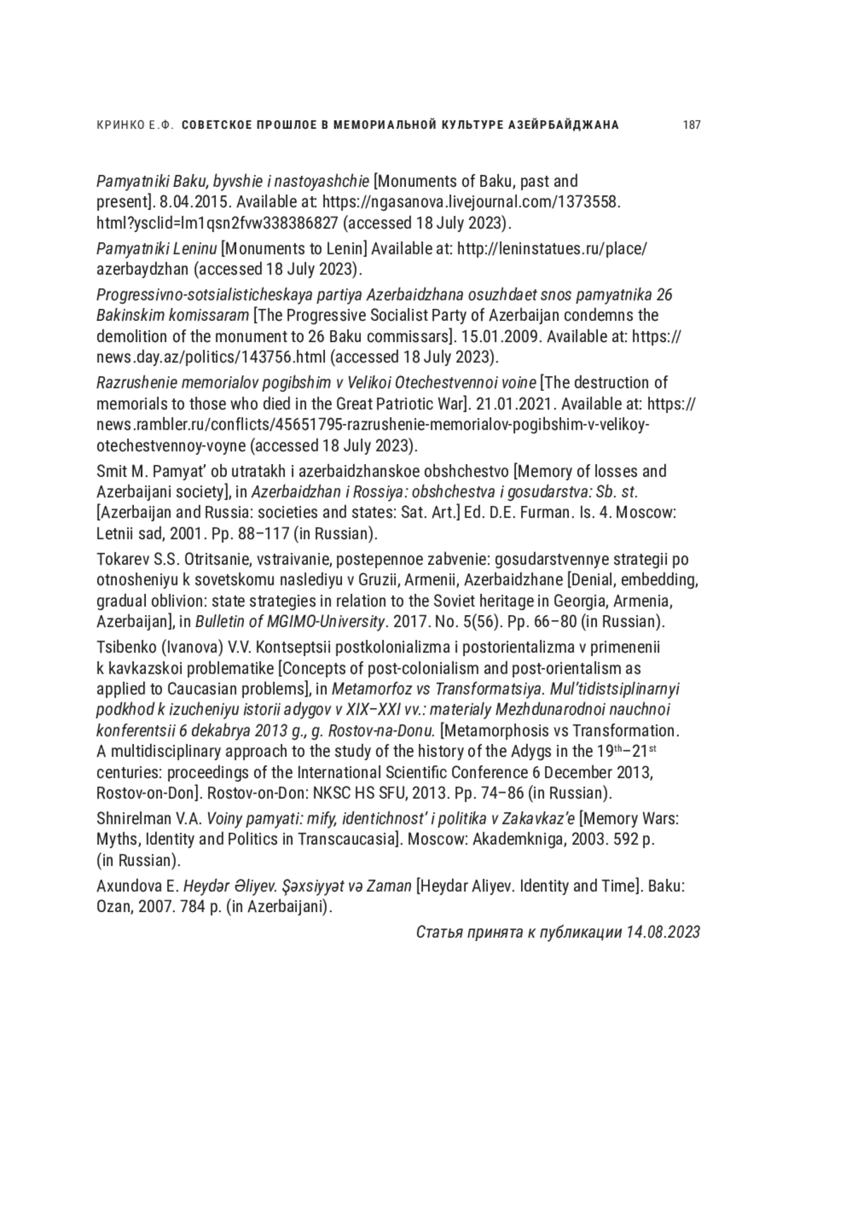 22. Токарев С.С. Отрицание, встраивание, постепенное забвение: государственные стратегии по отношению к советскому наследию в Грузии, Армении, Азербайджане // Вестник МГИМО-Университета. 2017. № 5 (56). С. 66-80. EDN: ZTWOVN