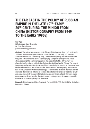 Статья представляет собой обобщение китайской историографии с 1949 по начало 1990-х гг. о присутствии Российской империи на Дальнем Востоке в конце XIX–начале XX в. После отступления армии Гоминьдана на Тайвань китайская историография разделилась на две части — континентальную и тайваньскую. По сравнению с предыдущим периодом развития, китайская историография второй половины XX в. отличалась крайней политизацией как на континенте, так и на Тайване. Второй особенностью, более характерной для континентальной историографии, является скудность источниковедческой базы. Лишь в 1980-х–начале 1990-х гг. источниковедческая ситуация улучшилась. Современные китайские историки часто описывают научную ситуацию второй половины XX в. фразеологизмом «проводить ритуалы внутри ракушки»: с одной стороны, ограничение в источниковедческом плане не позволило тогдашним историкам полноценно и всесторонне заниматься наукой, с другой стороны, они были гораздо энциклопедичнее и эрудированнее, чем современные коллеги, в связи с чем их работы нельзя считать полностью утратившими научную ценность