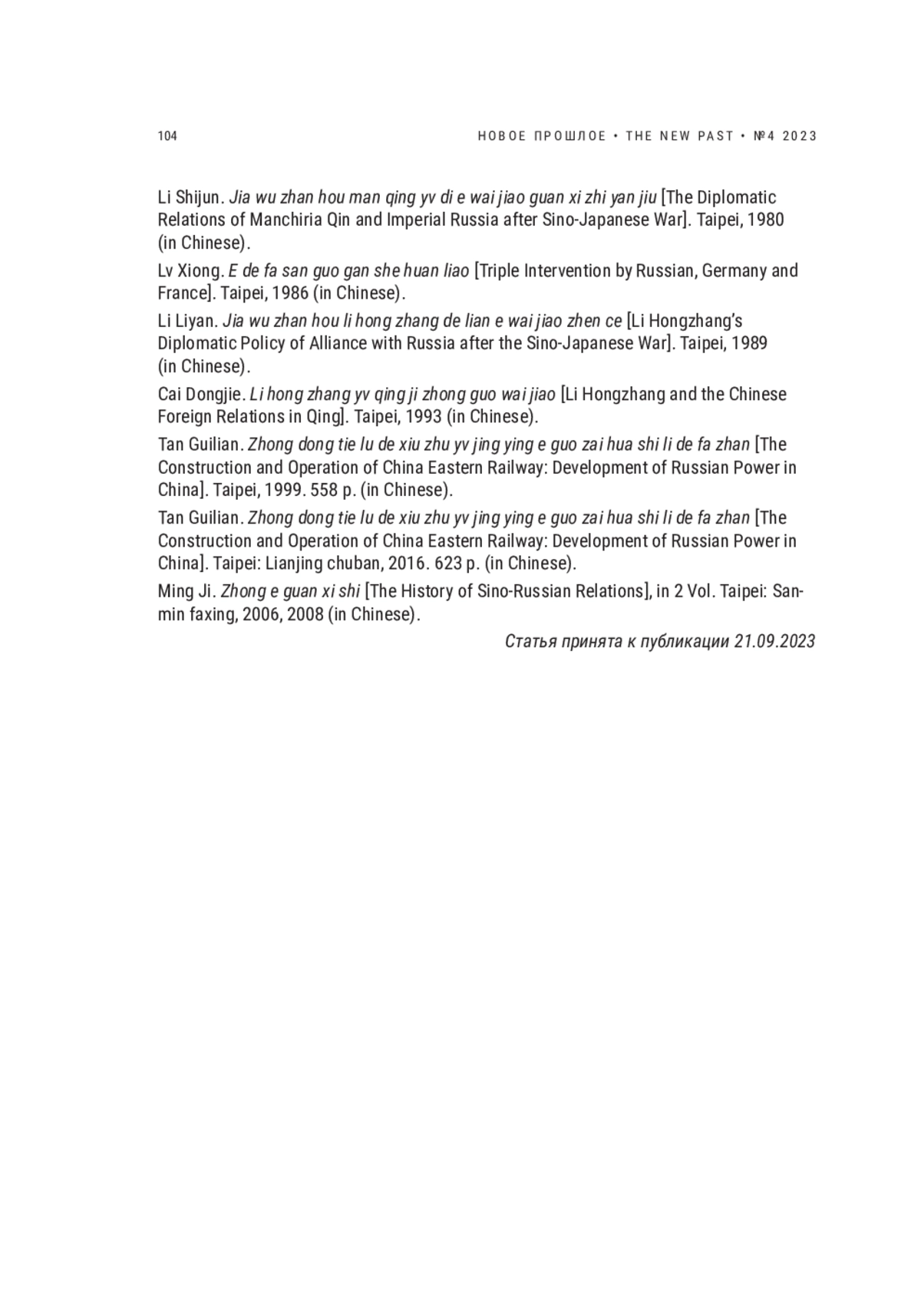 51. 李世鈞 (Ли Шицзюнь). 甲午戰後滿清與帝俄外交關係之研究(一八九五 一九 一) (Исследование по дипломатическим отношениям между маньчжурской Цин и императорской Россией после Китайско-Японской войны): магистерская диссертация 中國文化大學 (Китайского университета культуры). Тайбэй, 1980.