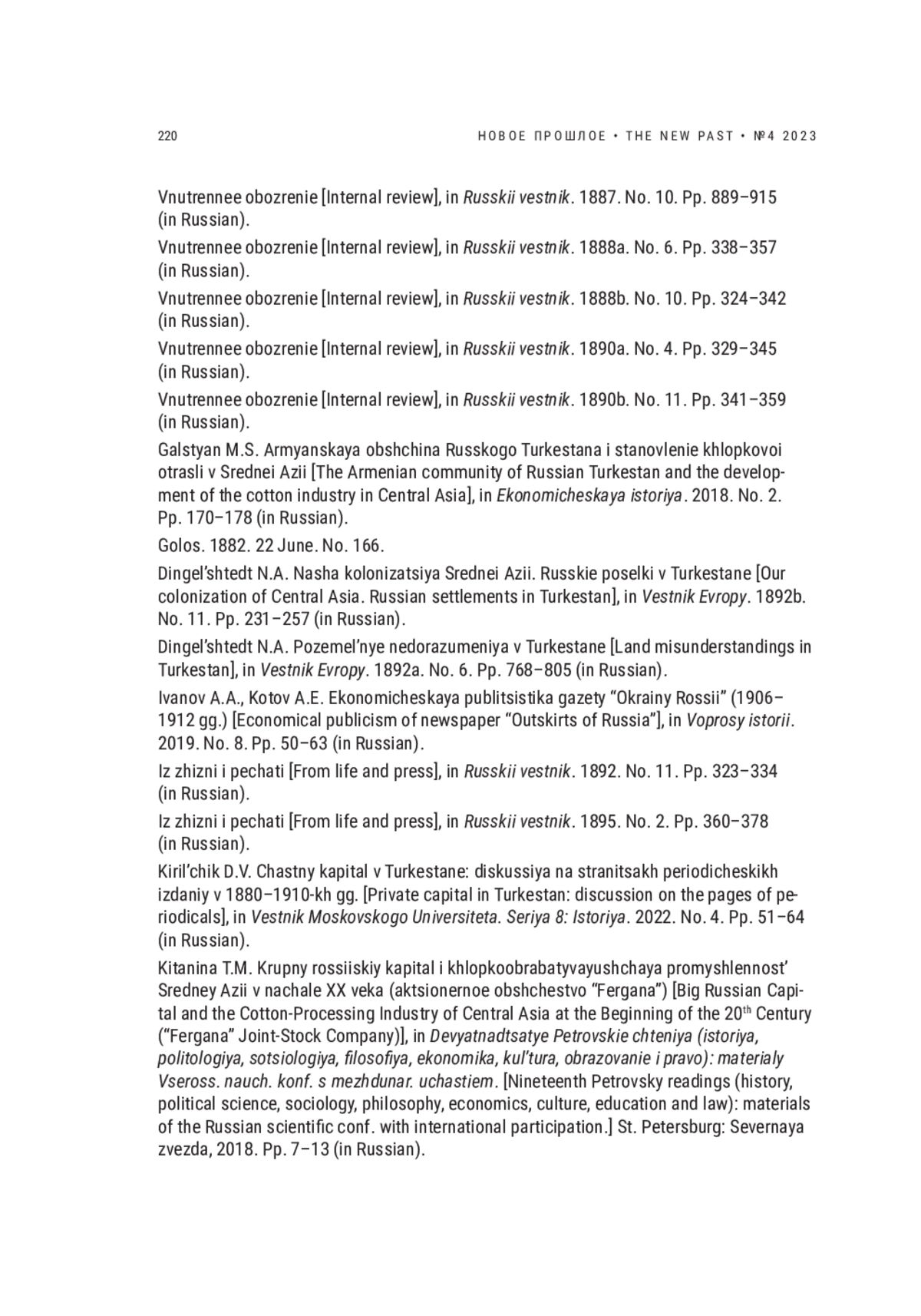 15. Кирильчик Д.В. Частный капитал в Туркестане: дискуссия на страницах периодических изданий в 1880-1910-х гг. // Вестник Московского Университета. Серия 8: История. 2022. № 4. С. 51-64. EDN: VXCSIS