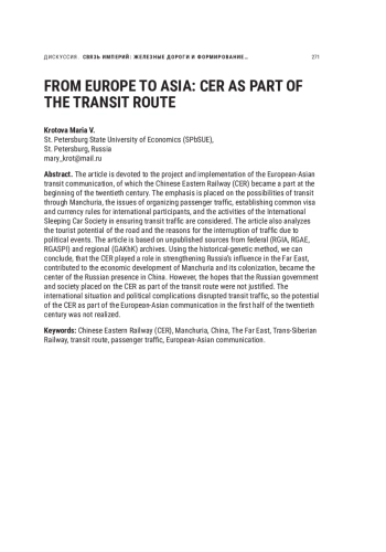 Статья посвящена проекту и реализации европейско-азиатского транзитного сообщения, частью которого в начале ХХ в. стала Китайско-Восточная железная дорога (КВЖД). Акцент сделан на возможностях транзита через Маньчжурию, рассматриваются вопросы организации перевозки пассажиров, установления общих визовых и валютных правил международных участников, деятельности Международного общества спальных вагонов в обеспечении транзитного сообщения. В статье также анализируются туристический потенциал дороги и причины прерывания движения из-за политических событий. Статья основана на неопубликованных источниках из федеральных (РГИА, РГАЭ, РГАСПИ) и регионального (ГАХК) архивов. Используя историко-генетический метод, можно сделать вывод, что дорога сыграла свою роль в укреплении влияния России на Дальнем Востоке, способствовала экономическому развитию Маньчжурии и ее колонизации, стала центром русского присутствия в Китае, но надежды, которые возлагало российское правительство и общество на КВЖД как часть транзитного пути, не оправдались. Международная ситуация, политические осложнения нарушали транзитное движение, так что потенциал КВЖД как части европейско-азиатского сообщения в первой половине ХХ в. не был реализован