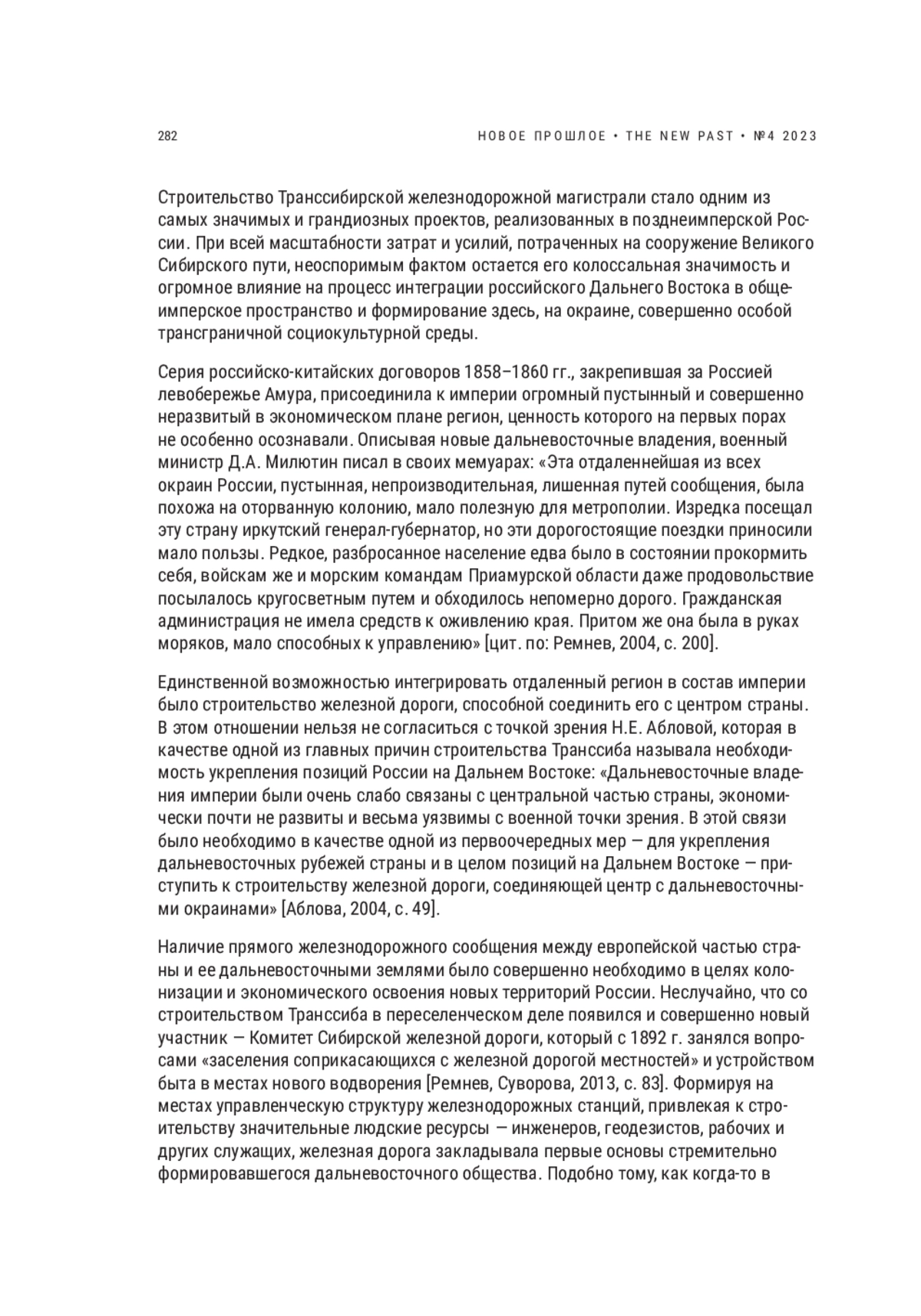 Строительство Транссибирской железнодорожной магистрали стало одним из самых значимых и грандиозных проектов, реализованных в позднеимперской России. При всей масштабности затрат и усилий, потраченных на сооружение Великого Сибирского пути, неоспоримым фактом остается его колоссальная значимость и огромное влияние на процесс интеграции российского Дальнего Востока в общеимперское пространство и формирование здесь, на окраине, совершенно особой трансграничной социокультурной среды