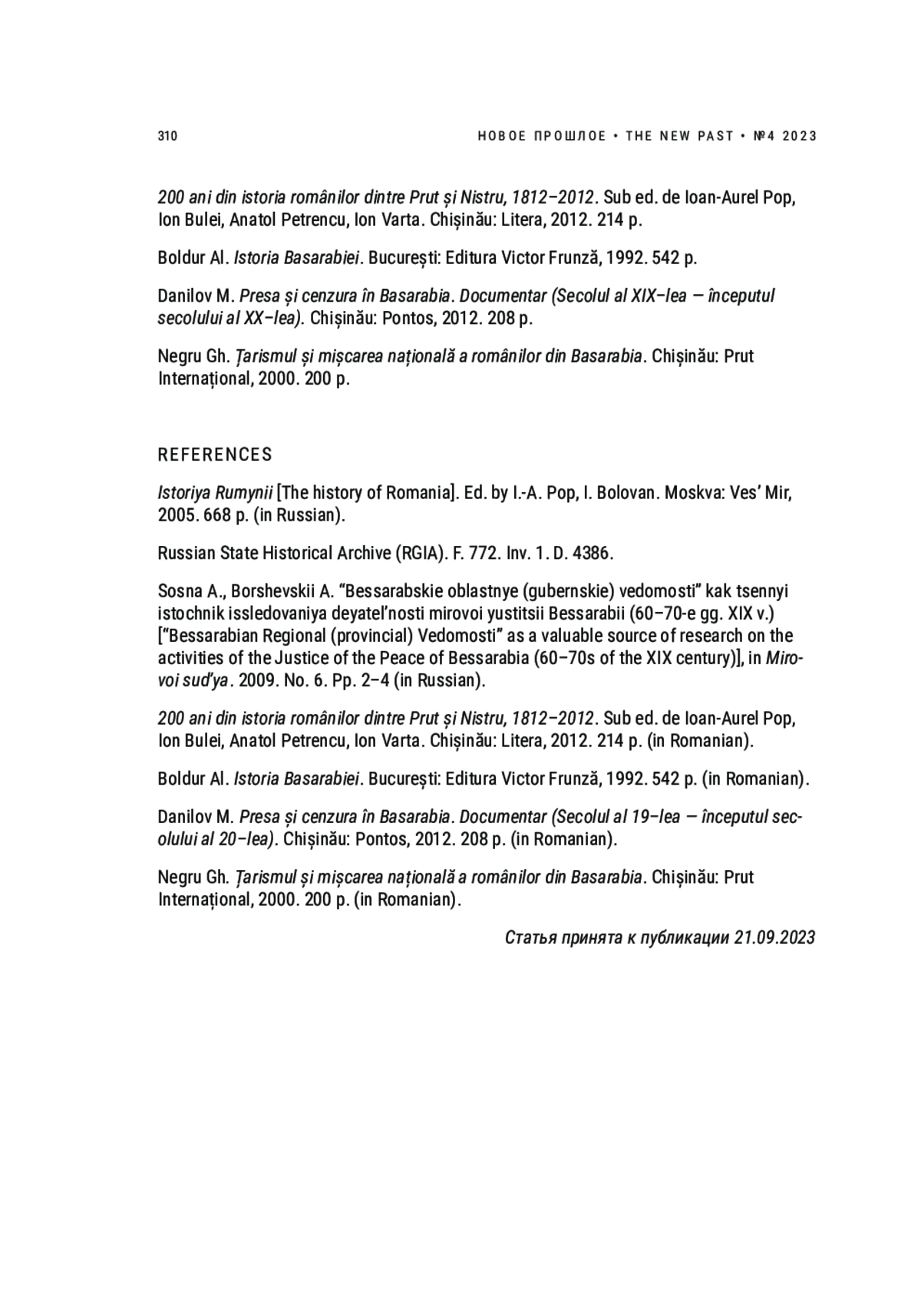 3. Сосна А., Боршевский А. “Бессарабские областные (губернские) ведомости” как ценный источник исследования деятельности мировой юстиции Бессарабии (60-70 е гг. XIX в.) // Мировой судья. 2009. № 6. С. 2-4. EDN: KPATVT