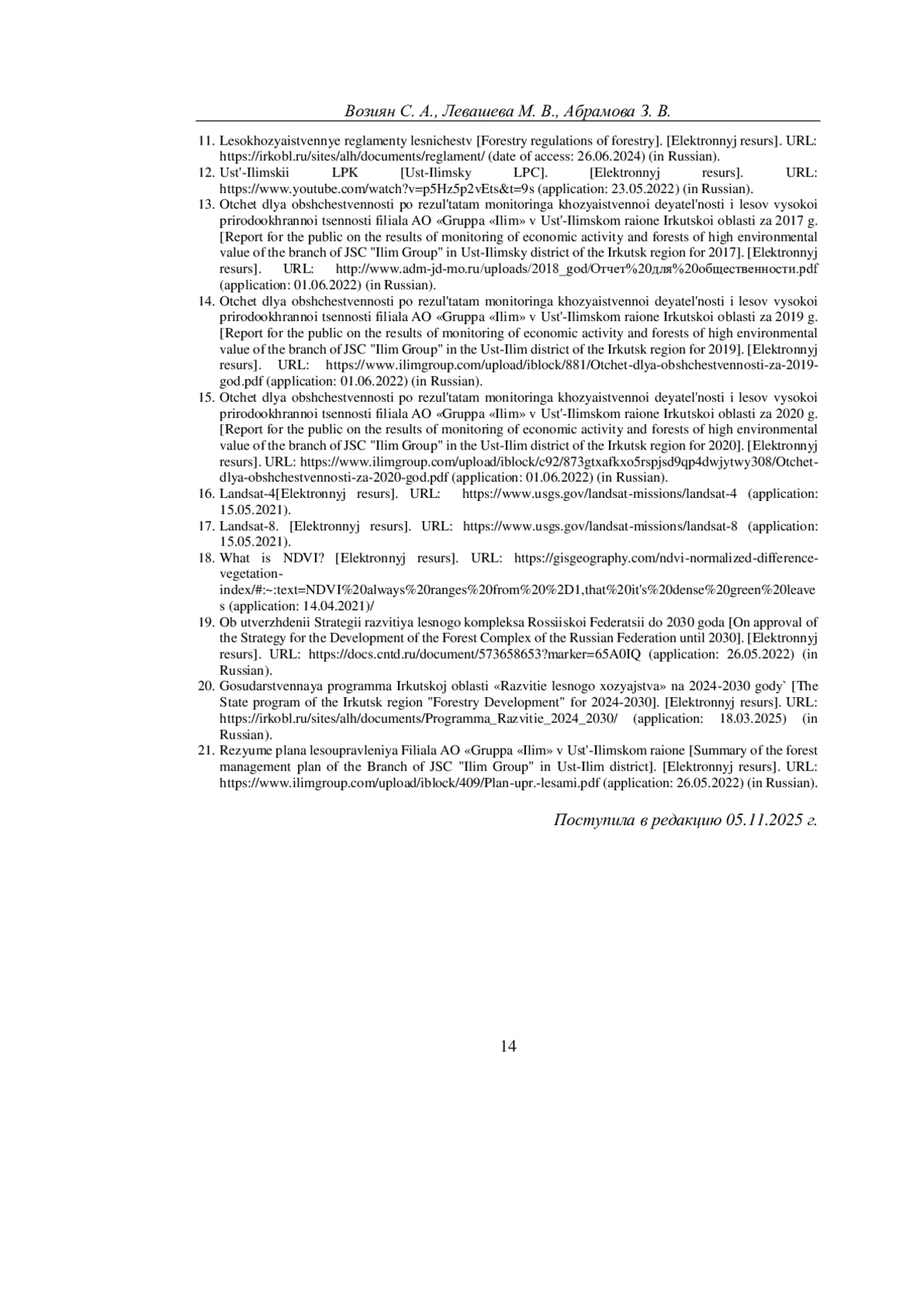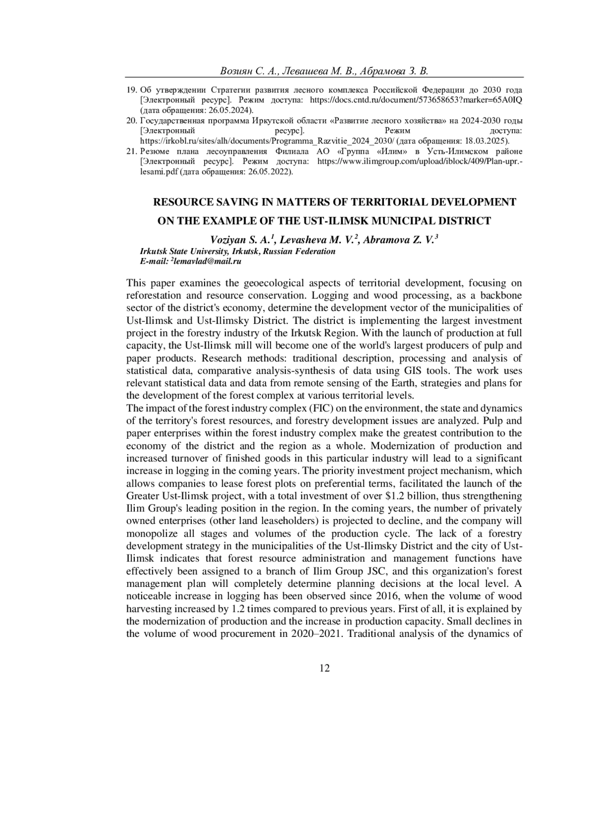 ВОЗИЯН С. А., ЛЕВАШЕВА М. В., АБРАМОВА З. В. РЕСУРСОСБЕРЕЖЕНИЕ В ВОПРОСАХ ТЕРРИТОРИАЛЬНОГО РАЗВИТИЯ НА ПРИМЕРЕ УСТЬ-ИЛИМСКОГО МУНИЦИПАЛЬНОГО РАЙОНА // УЧЕНЫЕ ЗАПИСКИ КРЫМСКОГО ФЕДЕРАЛЬНОГО УНИВЕРСИТЕТА ИМЕНИ В. И. ВЕРНАДСКОГО. ГЕОГРАФИЯ. ГЕОЛОГИЯ. 2025. ТОМ 11 (77). № 4