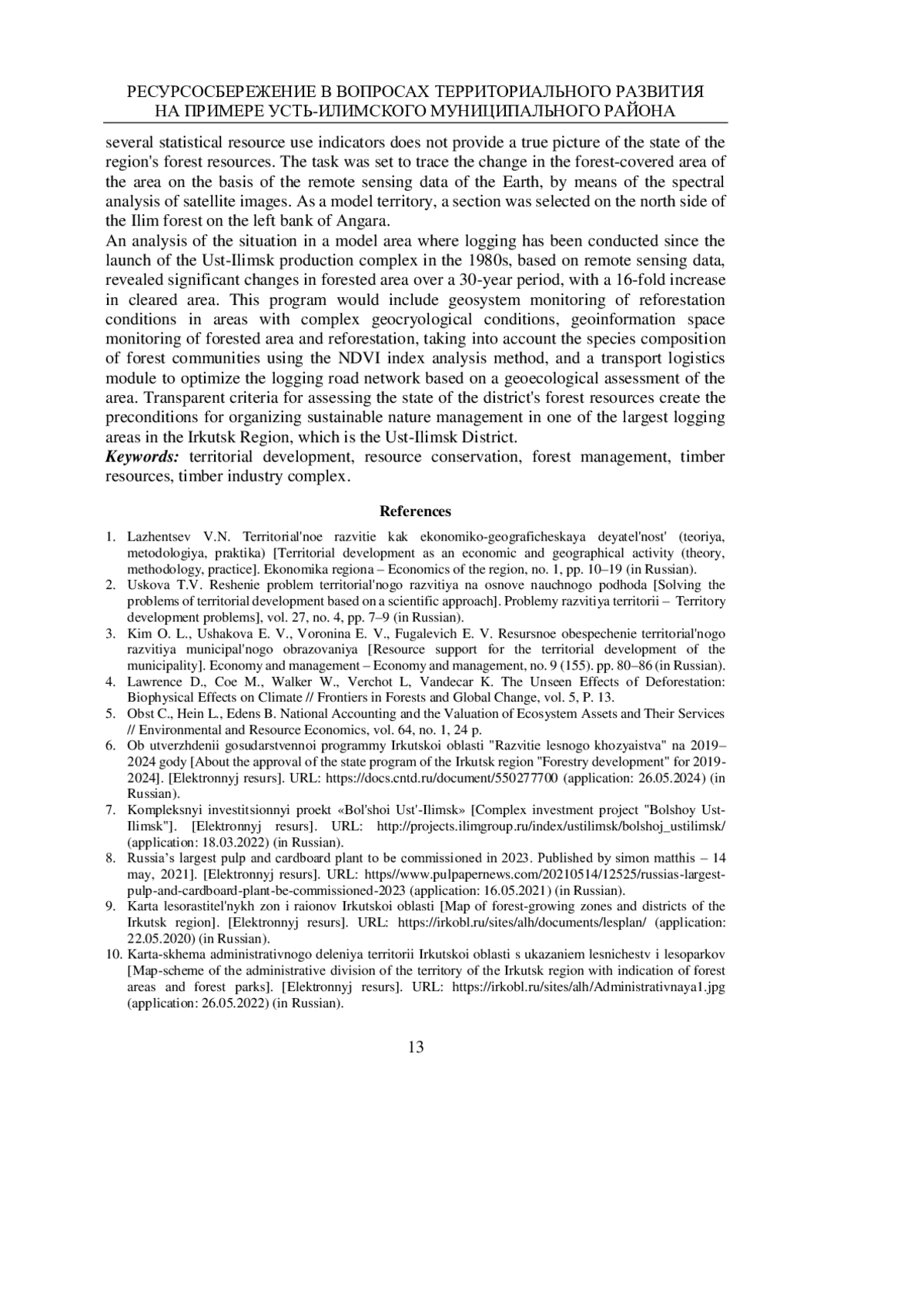 Ключевые фразы: территориальное развитие, ресурсосбережение, лесопользование, лесосырьевые ресурсы, лесопромышленный комплекс