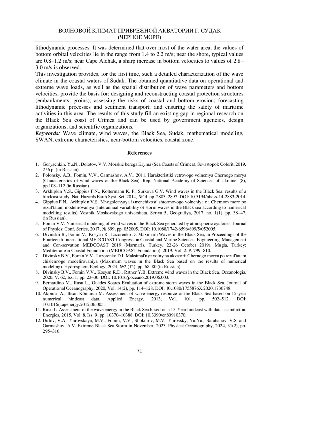 12. Дулов В.А., Юровская М.В., Фомин В.В., Шокуров М.В., Юровский Ю.Ю., Барабанов В.С., Гармашов А.В. Экстремальный черноморский шторм в ноябре 2023 года // Морской гидрофизический журнал. 2024. Т. 40, № 2. С. 325-347.