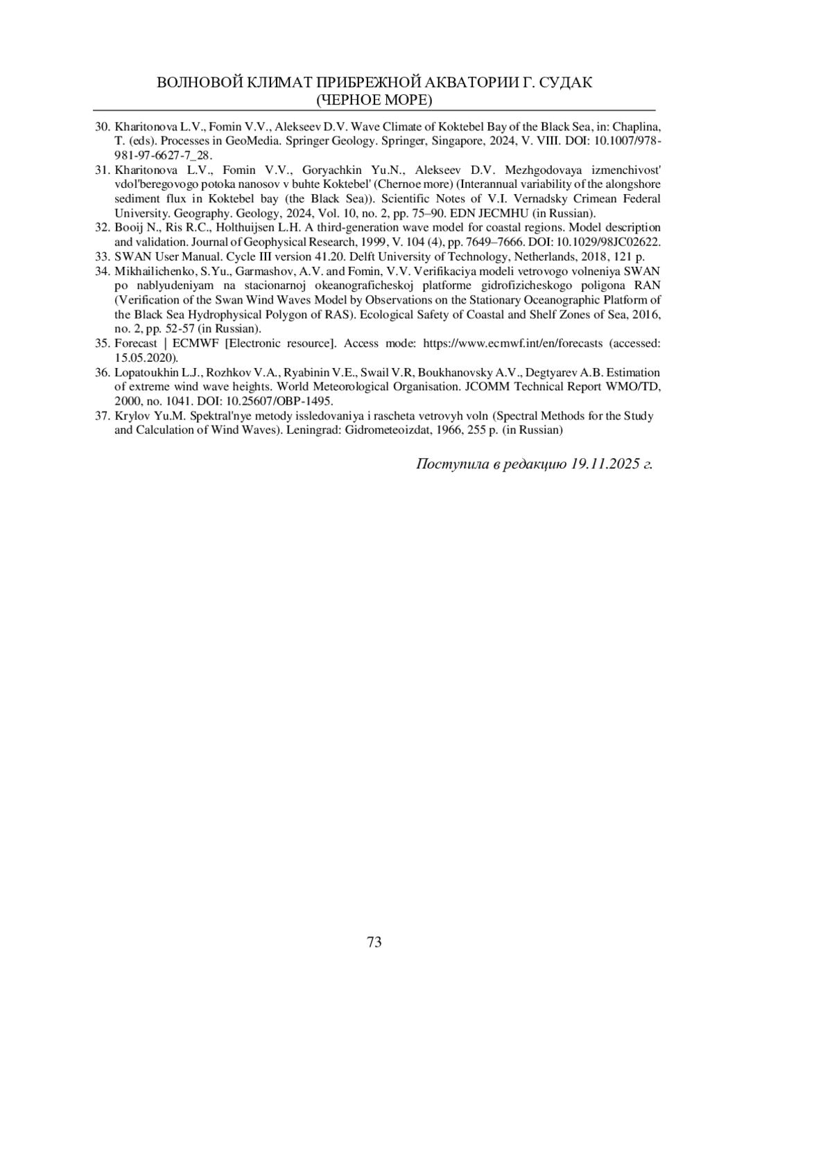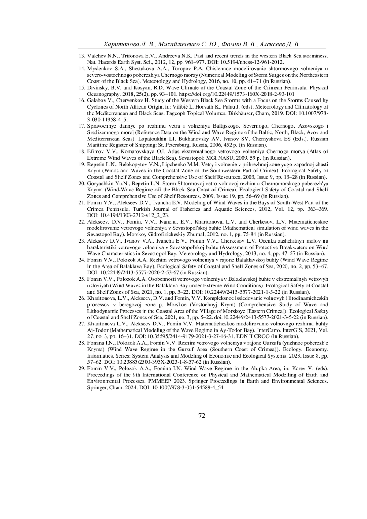30. Kharitonova L.V., Fomin V.V., Alekseev D.V. Wave Climate of Koktebel Bay of the Black Sea // In: Chaplina, T. (eds). Processes in GeoMedia. Springer Geology. Springer, Singapore. 2024. V. VIII. DOI: 10.1007/978-981-97-6627-7_28.