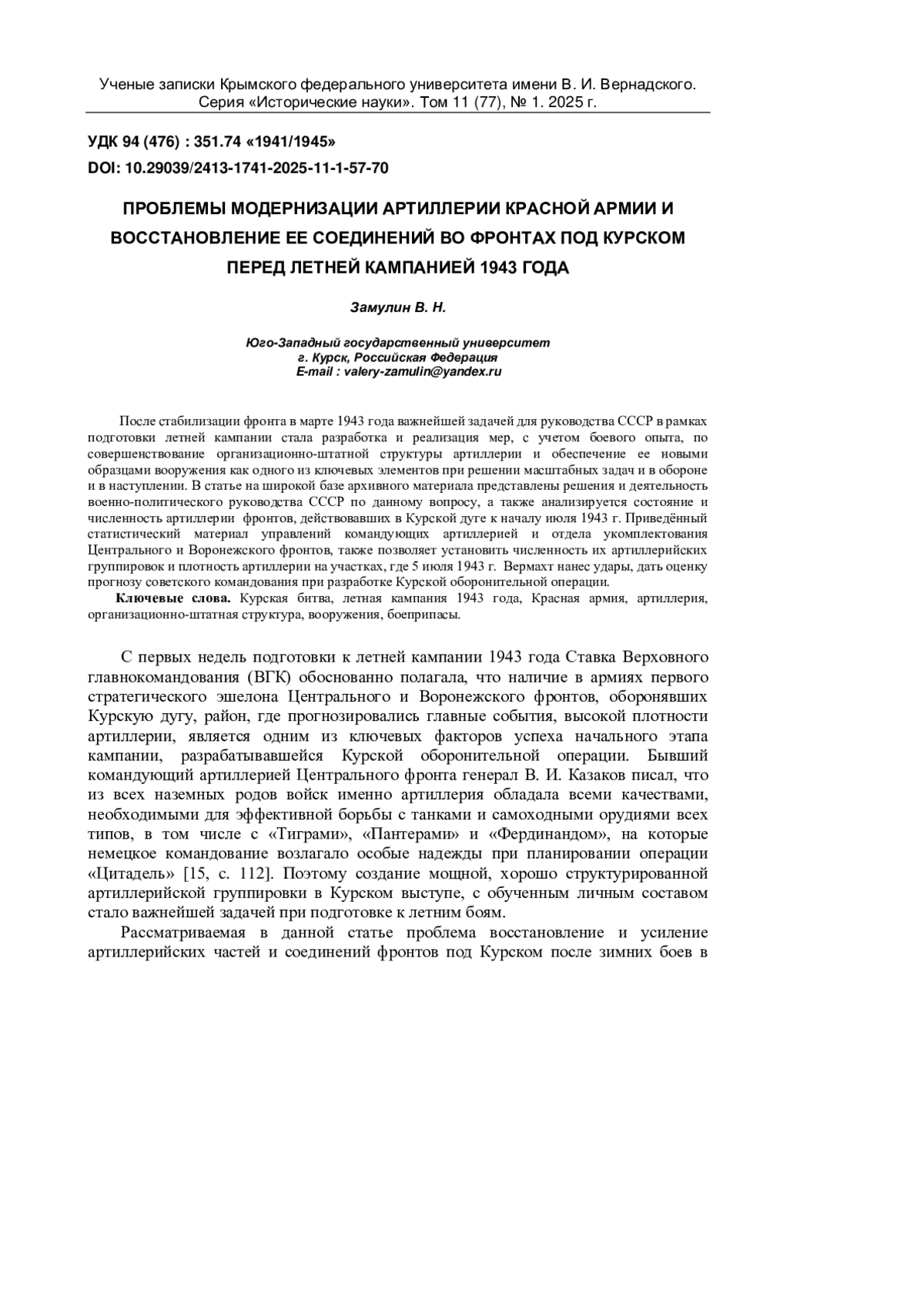 После стабилизации фронта в марте 1943 года важнейшей задачей для руководства СССР в рамках подготовки летней кампании стала разработка и реализация мер, с учетом боевого опыта, по совершенствование организационно-штатной структуры артиллерии и обеспечение ее новыми образцами вооружения как одного из ключевых элементов при решении масштабных задач и в обороне и в наступлении. В статье на широкой базе архивного материала представлены решения и деятельность военно-политического руководства СССР по данному вопросу, а также анализируется состояние и численность артиллерии фронтов, действовавших в Курской дуге к началу июля 1943 г. Приведённый статистический материал управлений командующих артиллерией и отдела укомплектования Центрального и Воронежского фронтов, также позволяет установить численность их артиллерийских группировок и плотность артиллерии на участках, где 5 июля 1943 г. Вермахт нанес удары, дать оценку прогнозу советского командования при разработке Курской оборонительной операции.
