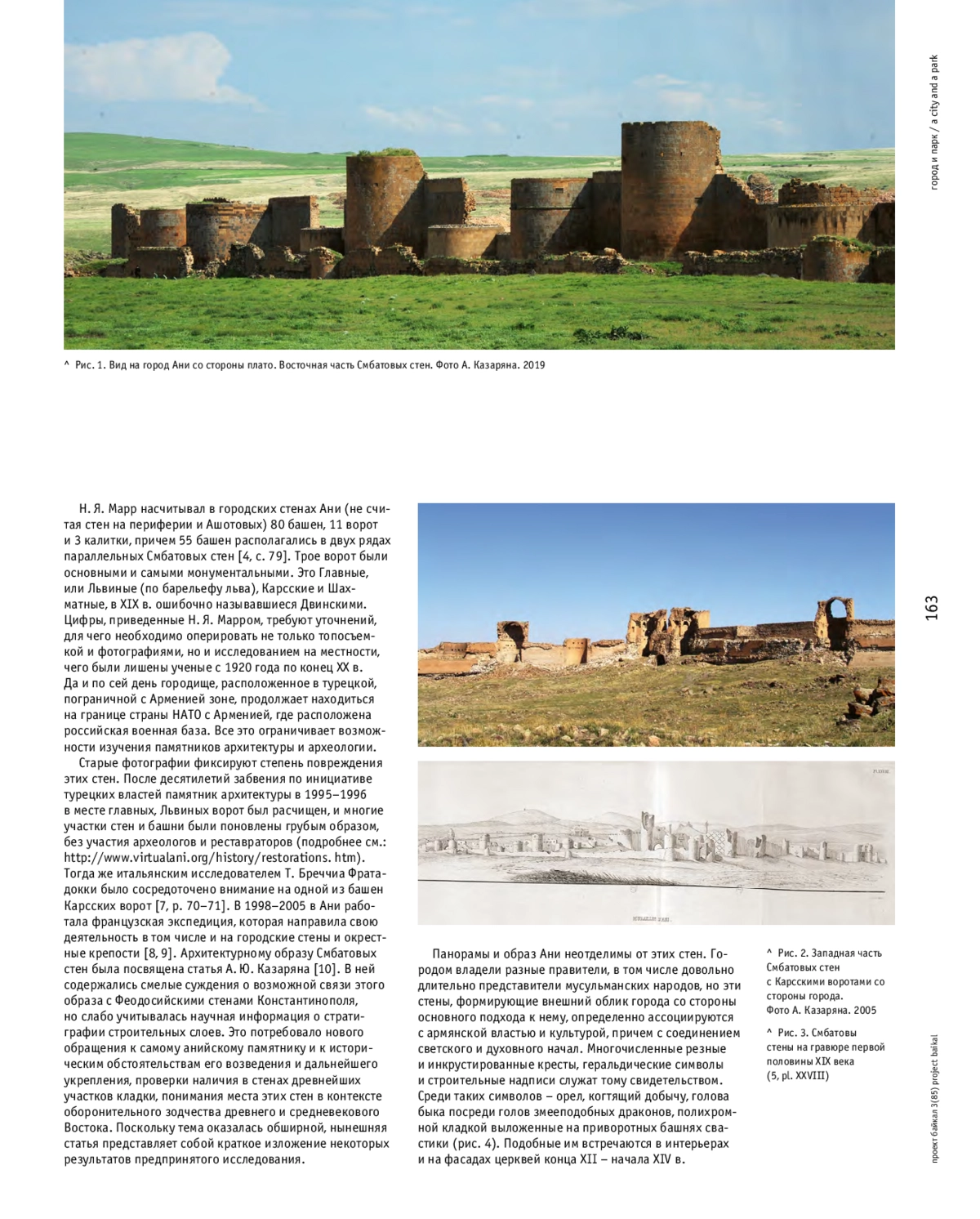Панораму столицы Армении эпохи Багратидов с многочисленными руинами церквей, остатками дворцов, мечетей, бань, жилых и производственных построек объединяют растянувшиеся на пару километров высокие городские стены, называемые Смбатовыми по имени основавшего их царя Смбата II Багратуни (977–989) (рис. 1–2). Воплощение в Ани концепции царского столичного города, в котором топографически объединяются светская и духовная власти, требовало его надежной защиты достойными фортификациями и выдвигало высокие требования к архитектурным качествам защитных сооружений, которые непосредственно оказывали влияние на образ основанного в 961 году и до XIV в. развивавшегося большого города. Одна стена с округлыми с внешней стороны башнями была сооружена по повелению первого коронованного в Ани царя, Ашота III Милостивого Багратуни (953–977) и защитила вышгород с царским дворцом и так называемый Старый город, который историк XII в. Мхитар Анеци называет «малым городом» (փոքր քաղաք) [1, с. 67; 2, p. 83–85].