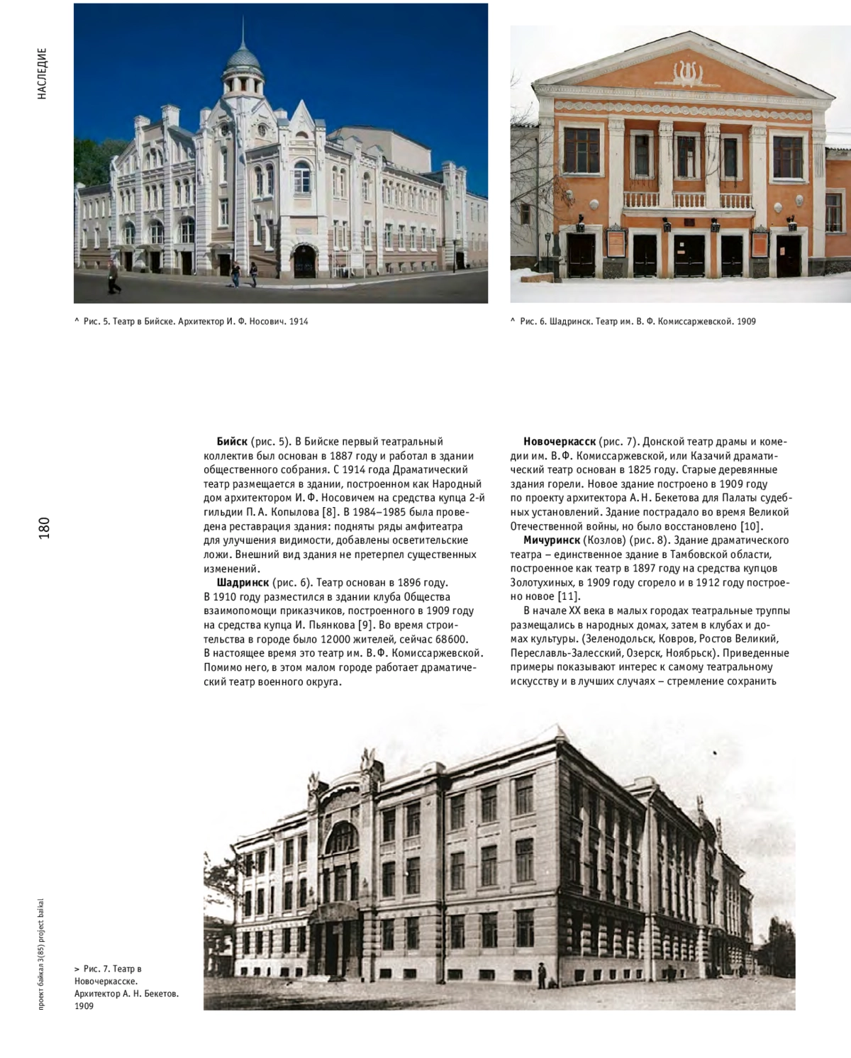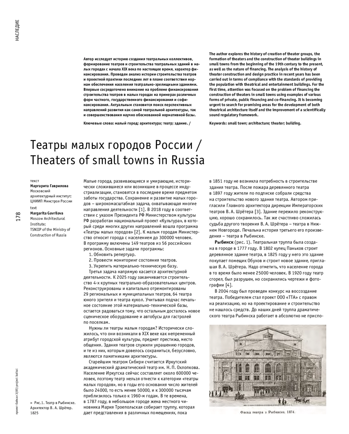 Автор исследует историю создания театральных коллективов, формирование театров и строительства театральных зданий в малых городах с начала XIX века по настоящее время, характер финансирования. Проведен анализ истории строительства театров и проектной практики последних лет в плане соответствия нормам обеспечения населения театрально-зрелищными зданиями. Впервые сосредоточено внимание на проблеме финансирования строительства театров в малых городах на примерах различных форм частного, государственного финансирования и софинансирования. Актуальным становится поиск перспективных направлений развития как самой театральной архитектуры, так и совершенствования научно обоснованной нормативной базы.