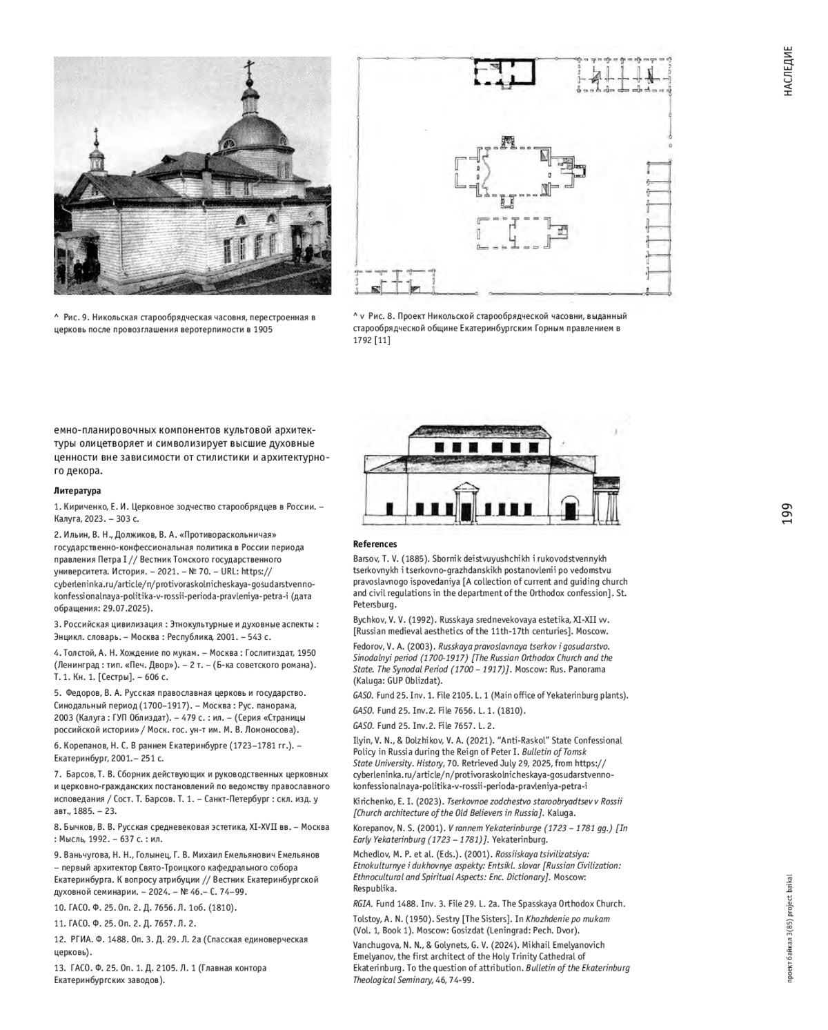 9. Ваньчугова, Н. Н., Голынец, Г. В. Михаил Емельянович Емельянов - первый архитектор Свято-Троицкого кафедрального собора Екатеринбурга. К вопросу атрибуции // Вестник Екатеринбургской духовной семинарии. - 2024. - № 46.- С. 74-99.