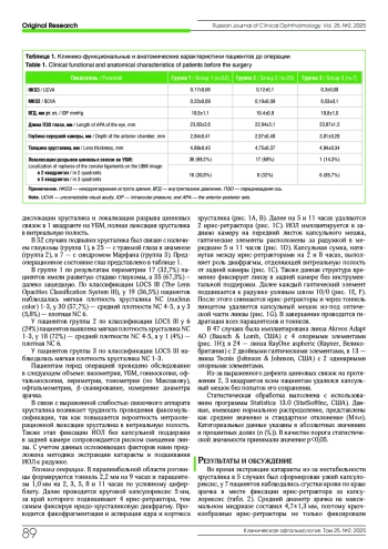 Результаты исследования: через 2 года после хирургического лечения катаракты с несостоятельностью связочного аппарата хрусталика при ультразвуковой биомикроскопии наблюдался наклон линзы (в группе 1 — в 13,5% случаев, в группе 2 — в 8%, в группе 3 — в 14,3%). МКОЗ составила 0,52±0,06, 0,68±0,05 и 0,87±0,1 соответственно.