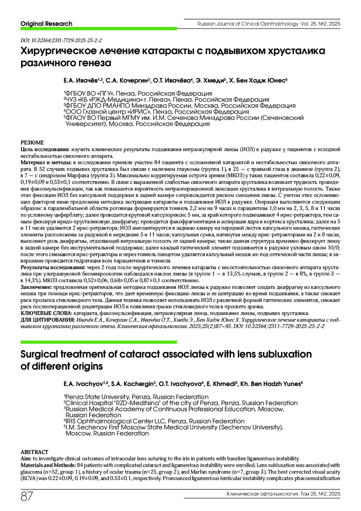 Материал и методы: в исследовании приняли участие 84 пациента с осложненной катарактой и нестабильностью связочного аппарата. В 52 случаях подвывих хрусталика был связан с наличием глаукомы (группа 1), в 25 — с травмой глаза в анамнезе (группа 2), в 7 — с синдромом Марфана (группа 3). Максимально корригируемая острота зрения (МКОЗ) у таких пациентов составила 0,22±0,09, 0,19±0,09 и 0,53±0,1 соответственно. В связи с выраженной слабостью связочного аппарата хрусталика возникает трудность проведения факоэмульсификации, так как повышается вероятность интраоперационной люксации хрусталика в витреальную полость. Также этап фиксации ИОЛ без капсульной поддержки в задней камере сопровождается риском смещения линзы. С учетом этих осложняющих факторов нами предложена методика экстракции катаракты и подшивания ИОЛ к радужке. Операция выполняется следующим образом: в паралимбальной области роговицы формируются тоннель 2,2 мм на 9 часах и парацентезы 1,0 мм на 2, 3, 5, 8 и 11 часах по условному циферблату; далее проводится круговой капсулорексис 5 мм, за край которого подвешивают 4 ирис-ретрактора, тем самым фиксируя иридо-хрусталиковую диафрагму; проводится факофрагментация и аспирация ядра и кортекса хрусталика; далее на 5 и 11 часах удаляются 2 ирис-ретрактора; ИОЛ имплантируется в заднюю камеру на передний листок капсульного мешка, гаптические элементы расположены за радужкой в меридиане 5 и 11 часов; капсульная сумка, натянутая между ирис-ретракторами на 2 и 8 часах, выполняет роль диафрагмы, отделяющей витреальную полость от задней камеры; также данная структура временно фиксирует линзу в задней камере без инструментальной поддержки; далее каждый гаптический элемент подшивается к радужке узловым швом 10/0; после этого снимаются ирис-ретракторы и через тоннель пинцетом удаляется капсульный мешок из-под оптической части линзы; в завершение проводится гидратация всех парацентезов и тоннеля.