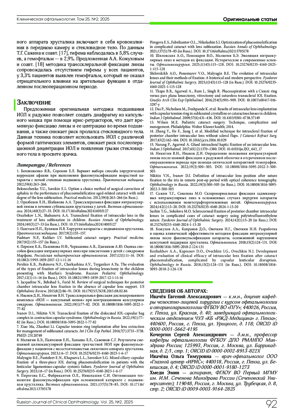 9. Пирогова Е.С., Фабрикантов О.Л., Николашин С.И. Оптимизация технологии факоэмульсификации при осложненной катаракте с подвывихом хрусталика. Вестник офтальмологии. 2021;137(5):78-85. DOI: 10.17116/oftalma202113705178