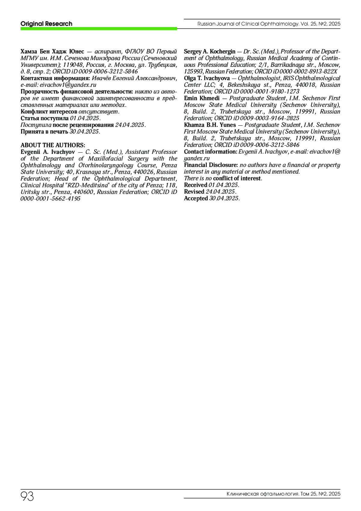16. Никитин В.Н., Иванов Д.И. Определение положения интраокулярной линзы после шовной фиксации к радужной оболочке в отсроченном послеоперационном периоде при помощи оптической когерентной томографии. Офтальмология. 2022;19(3):500-505. DOI.