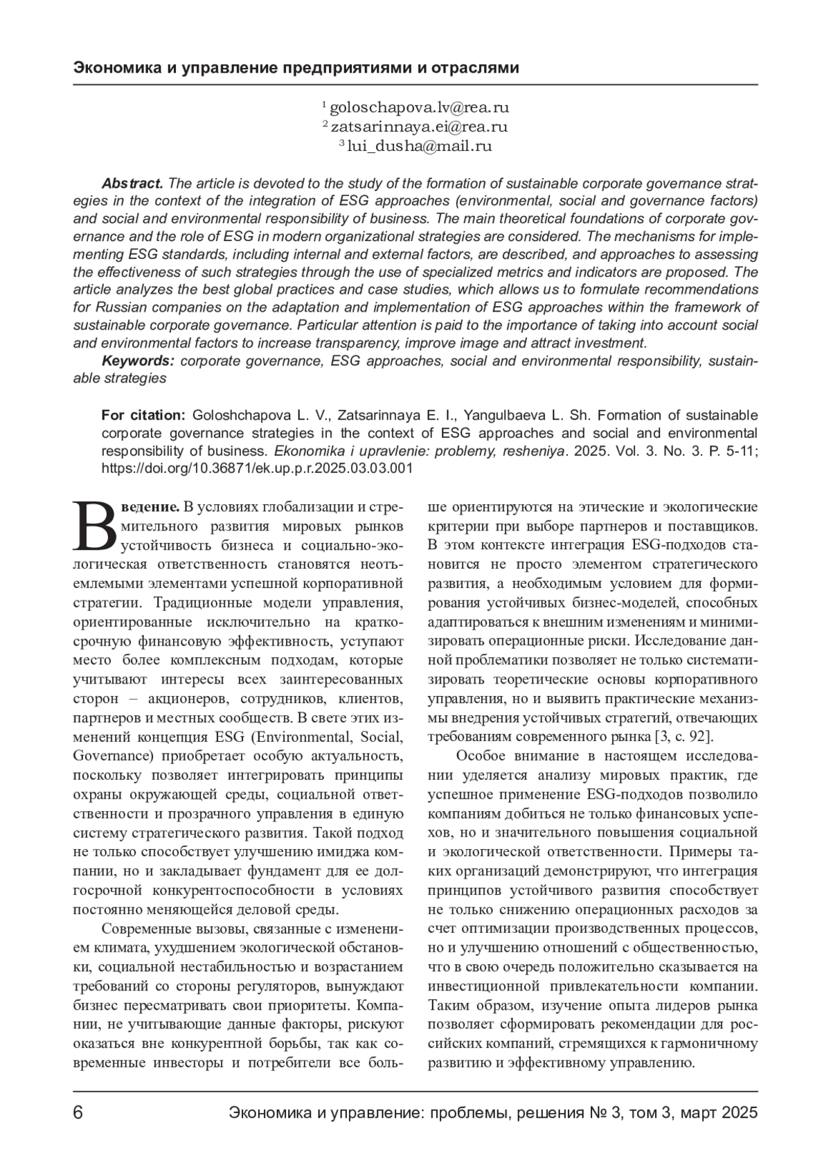 Статья посвящена исследованию формирования устойчивых стратегий корпоративного управления в контексте интеграции ESG-подходов (экологические, социальные и управленческие факторы) и социально-экологической ответственности бизнеса. Рассмотрены основные теоретические основы корпоративного управления и роль ESG в современных стратегиях организаций. Описаны механизмы внедрения ESG-стандартов, включая внутренние и внешние факторы, а также предложены подходы к оценке эффективности таких стратегий через использование специализированных метрик и индикаторов. В статье анализируются лучшие мировые практики и кейс-стади, что позволяет сформировать рекомендации для российских компаний по адаптации и внедрению ESG-подходов в рамках устойчивого корпоративного управления. Особое внимание уделяется важности учета социально-экологических факторов для повышения прозрачности, улучшения имиджа и привлечения инвестиций.