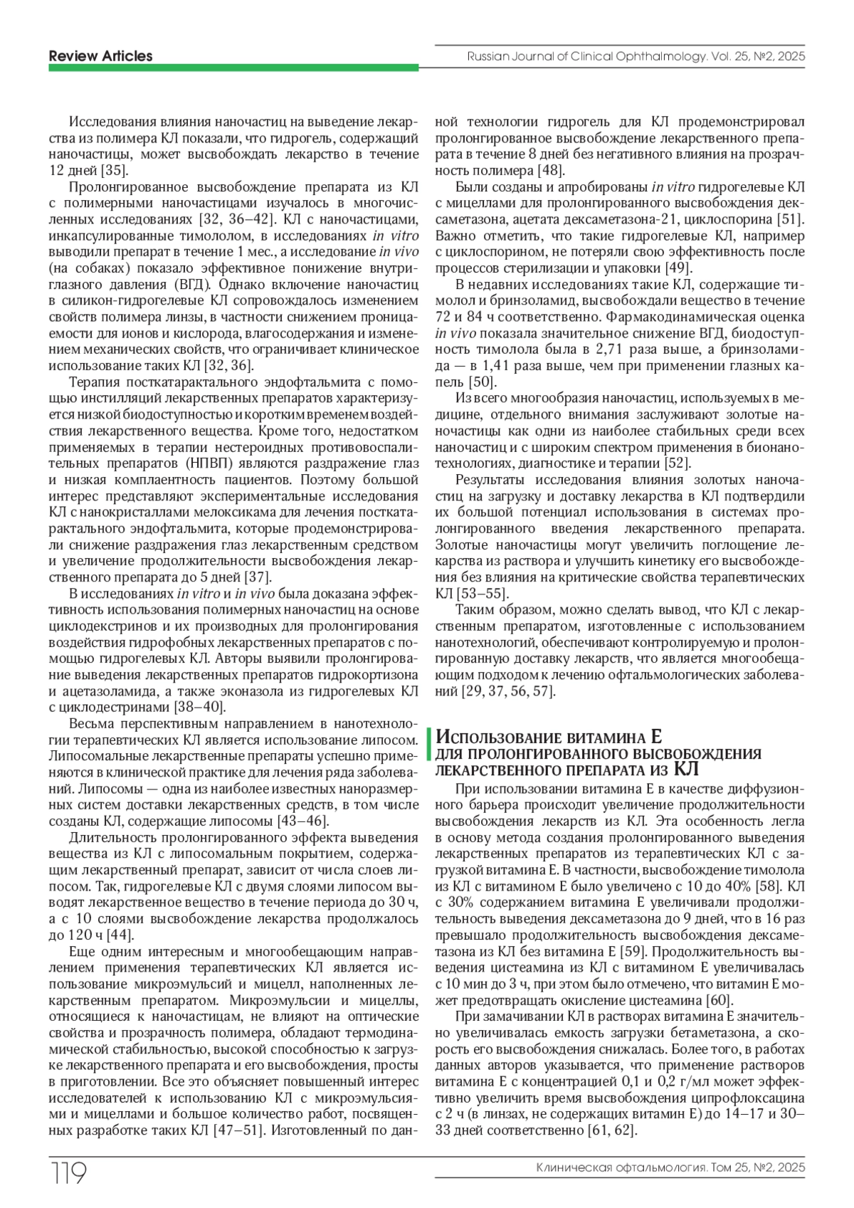 70. Torres-Luna C., Hu N., Tammareddy T. et al. Extended delivery of non-steroidal anti-inflammatory drugs through contact lenses loaded with Vitamin E and cationic surfactants. Cont Lens Anterior Eye. 2019;42(5):546-552. DOI: 10.1016/j.clae.2019.04.01