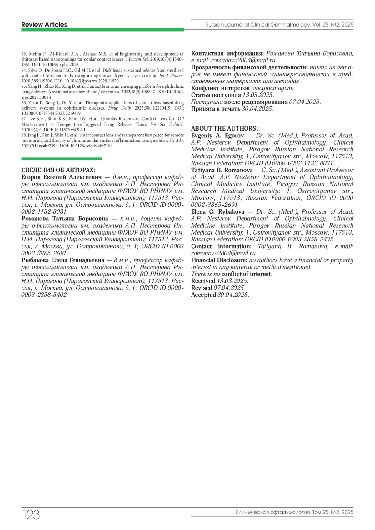 81. Bengani L.C., Kobashi H., Ross A.E. et al. Steroid-eluting contact lenses for corneal and intraocular inflammation. Acta Biomater. 2020;116:149-161. DOI: 10.1016/j.actbio.2020.08