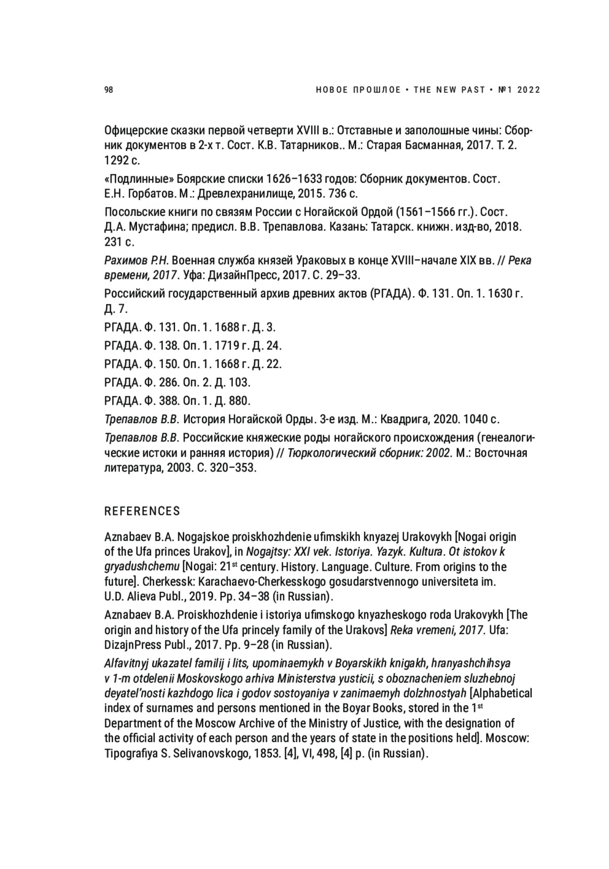 27. Трепавлов В.В. Российские княжеские роды ногайского происхождения (генеалогические истоки и ранняя история) // Тюркологический сборник: 2002. М.: Восточная литература, 2003. С. 320-353. EDN: WLBRSP