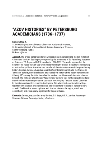 Статья посвящена обстоятельствам создания и бытования двух сочинений по древней и новой истории Крыма и Приазовья, написанных профессорами Петербургской академии наук Т. З. Байером и Г. Ф. В. Юнкером в 1736–1737 гг. Работы появились в разгар русско-турецкой войны, что придало им еще большую остроту, а принадлежность авторов к негласной rei publicae litterariae ввело в канон европейской научной литературы. При этом Байер и Юнкер показали разные исследовательские подходы: первый, будучи «кабинетным» ученым, привлек труды классиков и проследил историю края с древности до начала XVIII в., второй описал современное его состояние, которое видел сам. Работы имели разную судьбу: «Азовская история» Байера была сразу опубликована и вошла в гимназическую программу как образцовый «русский автор», а из сочинения Юнкера напечатали лишь отрывок спустя тридцать лет. В данной статье обе работы впервые проанализированы вместе, для чего использованы неизвестные ранее архивные материалы, в том числе две авторские редакции труда Юнкера. Исторические сочинения Байера и Юнкера рассказывают о регионе, имевшем немалое научное и стратегическое значение для Российской империи