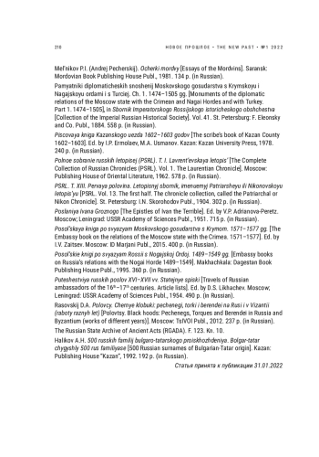 13. Посольская книга по связям Московского государства с Крымом. 1571-1577 гг. / отв. ред. И.В. Зайцев. М.: ИД Марджани, 2015. 400 с. EDN: YHAVXT
