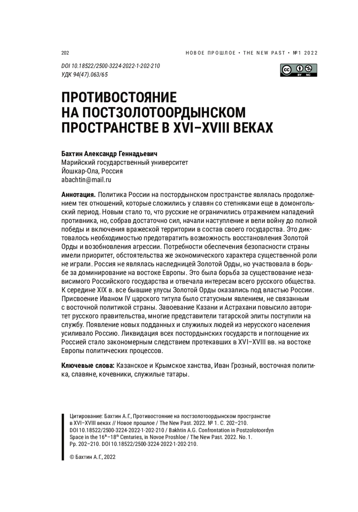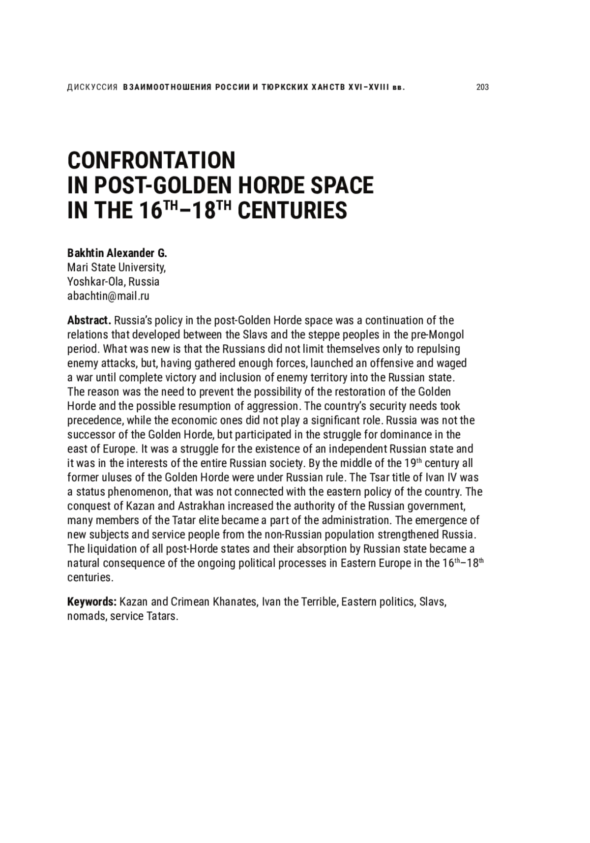 Публикация подготовлена в плане актуальной дискуссии о судьбах приграничных славяно-тюркских взаимоотношений как очень противоречивых и многогранных. Показаны разноплановость интересов с обеих сторон, разграничение и взаимосвязь оседлого и кочевого мира. Обозначен т. н. «интерстадиал» (лат. «зазор между ступенями») как практически непременный этап вхождения ханств, орд и родоплеменных структур в состав Российского государства. Подчеркнут разноуровневый характер общения в сферах власти и дипломатии, боевой конкуренции и в личных контактах, непременных в соседних этносах. Привлечены примеры перехода от Астраханского ханства к российскому Астраханскому воеводству. Как любопытные предметы для рассмотрения предстают менявшие друг друга ситуации «войн» и «мира», положения «свои — чужие» в необычных вариантах «свои, осевшие среди чужих» и «чужие, но все более близкие к своим». Некоторые ситуации пока еще малоизучены: об особых интересах Османской Турции на Дону и на Волге, о мирном курултае на р. Казанке в середине августа 1551 г., о традициях трактовок давних событий, переживших столетия до наших дней и др