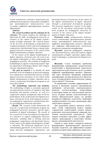 Проблема исследования и обоснование ее актуальности. В статье рассматриваются проблемы повышения квалификации преподавателя педагогического вуза в условиях цифровой трансформации высшего образования. Исследование акцентирует внимание на необходимости разработки программы повышения квалификации для формирования универсальных педагогических компетенций и функциональной грамотности преподавателей педагогического вуза в условиях цифровой трансформации высшего образования. В условиях цифровой трансформации высшего образования преподаватели сталкиваются с необходимостью применять цифровые технологии в своей профессионально-педагогической деятельности. Проблема недостаточной методической поддержки в освоении современных цифровых образовательных технологий затрудняет процесс их интеграции в образовательную деятельность. Цель исследования - выявить основные проблемы формирования универсальных педагогических компетенций и функциональной грамотности преподавателя педагогического вуза в условиях цифровой трансформации высшего образования и создать программу повышения квалификации их для решения данной проблемы. Методология (материалы и методы) включает системный подход, включающий анализ нормативно-правовых документов и ресурсов сети Интернет, а также сравнительный анализ данных диагностики по реализации программы повышения квалификации, показывающий уровни сформированности универсальных педагогических компетенций и функциональной грамотности преподавателя педагогического вуза. Результаты исследования демонстрируют необходимость программы повышения квалификации преподавателей педагогического вуза и внедрение цифровых технологий. Новизна исследования заключается в разработке комплексных мер для поддержки преподавателей педагогического вуза, позволяющие формировать у них универсальных педагогических компетенций и функциональной грамотности в условиях цифровой трансформации высшего образования. Теоретическая значимость заключается в обосновании подходов к процессу формирования универсальных педагогических компетенций и функциональной грамотности преподавателей в условиях цифровой трансформации высшего образования через программу повышений их квалификации. Практическая значимость состоит в применении разработанной программы повышения квалификации преподавателей педагогического вуза в условиях цифровой трансформации высшего образования.