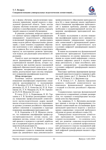 9. Степанова, И. Ю. Универсальные педагогические компетенции: попытка определения / И. Ю. Степанова, Н. Ф. Ильина. - Текст: непосредственный // Проблемы современного педагогического образования. - 2023. - № 80-4. - С. 244-248. EDN: XNKNKR