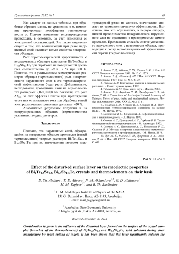 Абдинов Д. Ш., Алиева Т. Д., Ахундова Н. М., Абдинова Г. Д., Тагиев М. М., Бархалов Б. Ш. Влияние поверхностного нарушенного слоя на термоэлектрические свойства кристаллов Bi2Te2.7Se0.3, Bi0.5Sb1.5Te3 и термоэлементов на их основе 47