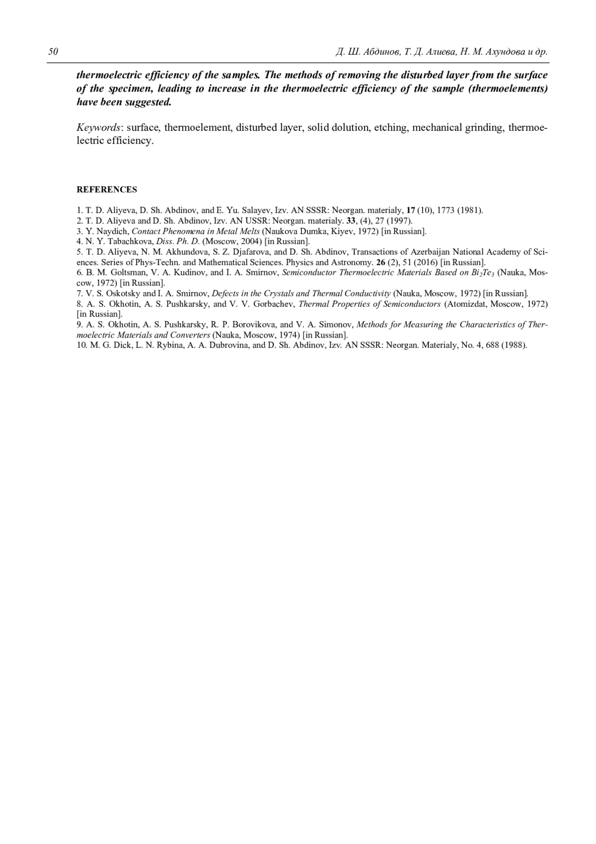 D. Sh. Abdinov, T. D. Aliyeva, N. M. Akhundova, G. D. Abdinova, M. M. Tagiyev, and B. Sh. Barkhalov Effect of the disturbed surface layer on thermoelectric properties of Bi2Te2.7Se0.3, Bi0.5Sb1.5Te3 crystals and thermoelements on their basis 47
